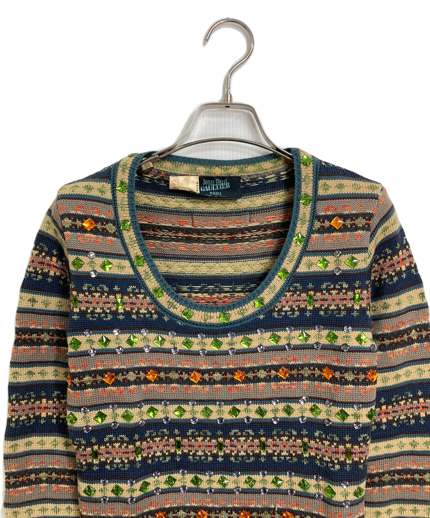 • Jean Paul GAULTIER(ジャンポールゴルチェ)Jean Paul GAULTIER (ジャンポールゴルチェ) ニットワンピース 長袖ワンピース ベージュ×ネイビー サイズ:実寸参照の古着・服飾アイテム フロント中央部分に小穴あり