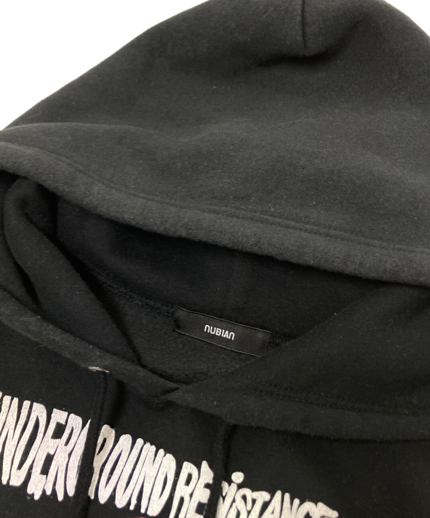 • nubian(ヌビアン)nubian (ヌビアン) プリントパーカー ブラック サイズ:Lの古着・服飾アイテム 内部毛羽立ち