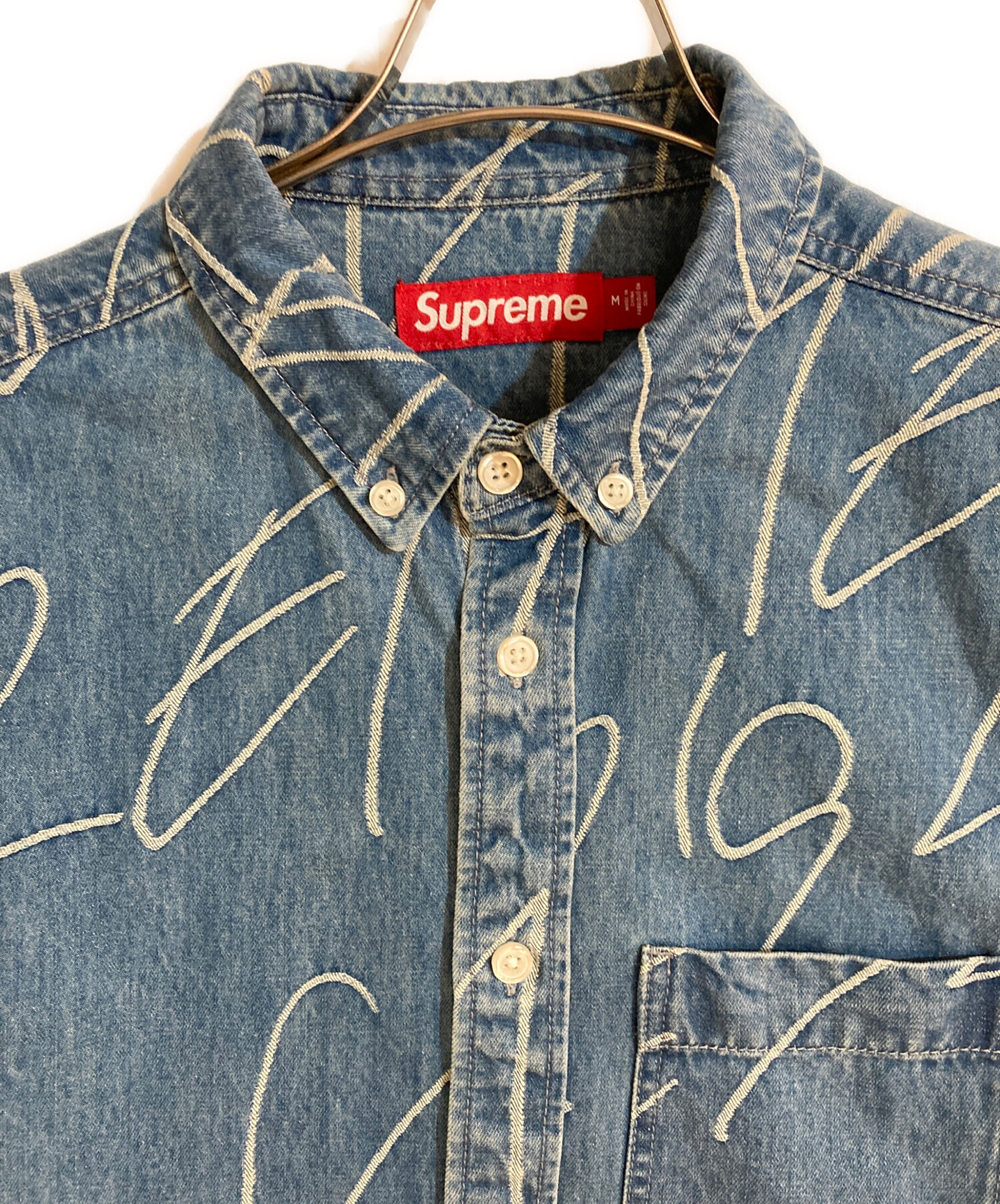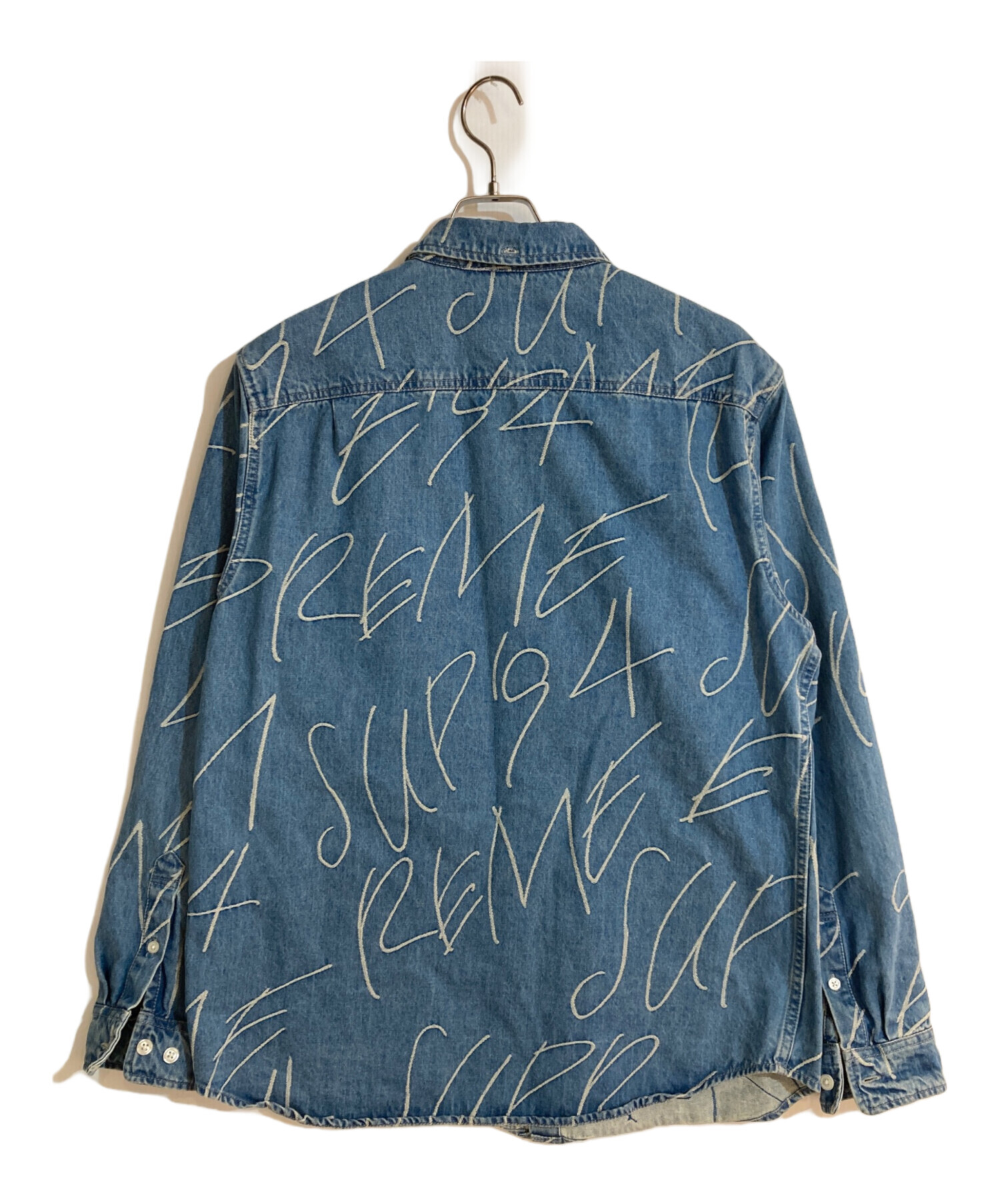 • SUPREME(シュプリーム)Supreme (シュプリーム) Handwriting Jacquard Denim Shirt/ ハンドライティングジャガードデニムシャツ インディゴ サイズ:Mの古着・服飾アイテム 襟ヨゴレ・アタリ有