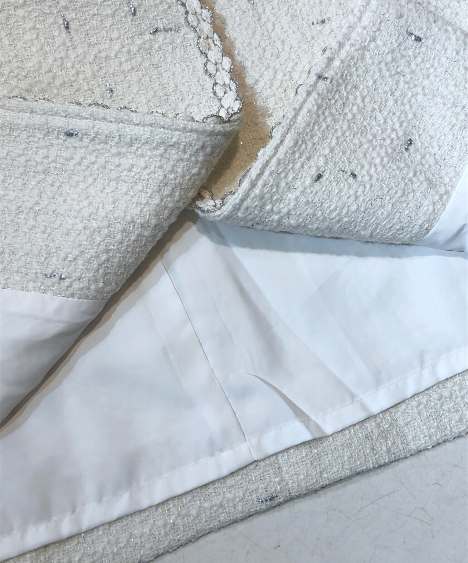 | 素材 | 表地: アクリル 39% 毛 33% ポリエステル 23% レーヨン 3% ナイロン 2% ブレード: 分類外繊維 37% レーヨン 34% ポリエステル 21% ナイロン 8% 別布: ポリエステル 100% 裏地: キュプラ 100% |