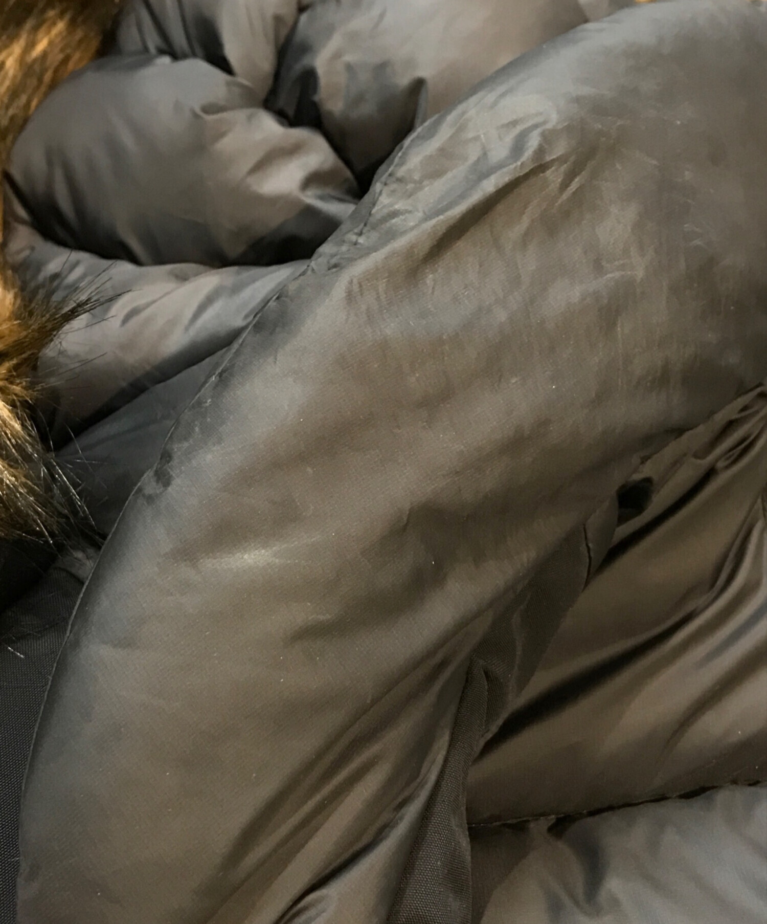 | 素材 | 表地 ナイロン100%(コーティング等樹脂加工) 中綿 ダウン72% レーヨン20% フェザー8% 裏地 ポリエステル100% 袖口 アクリル59% 毛26% ナイロン14% ポリウレタン1% フードファー部分 パイル アクリル系80% アクリル20% 基布 ポリエステル100% |