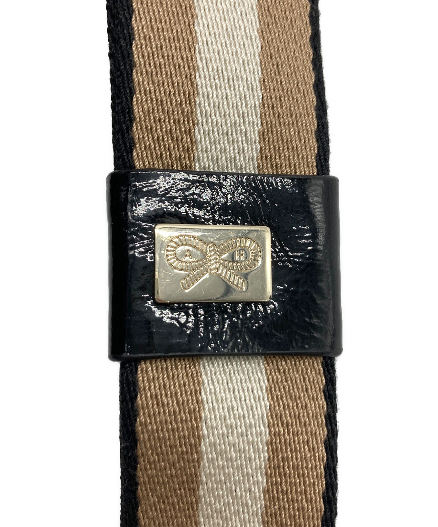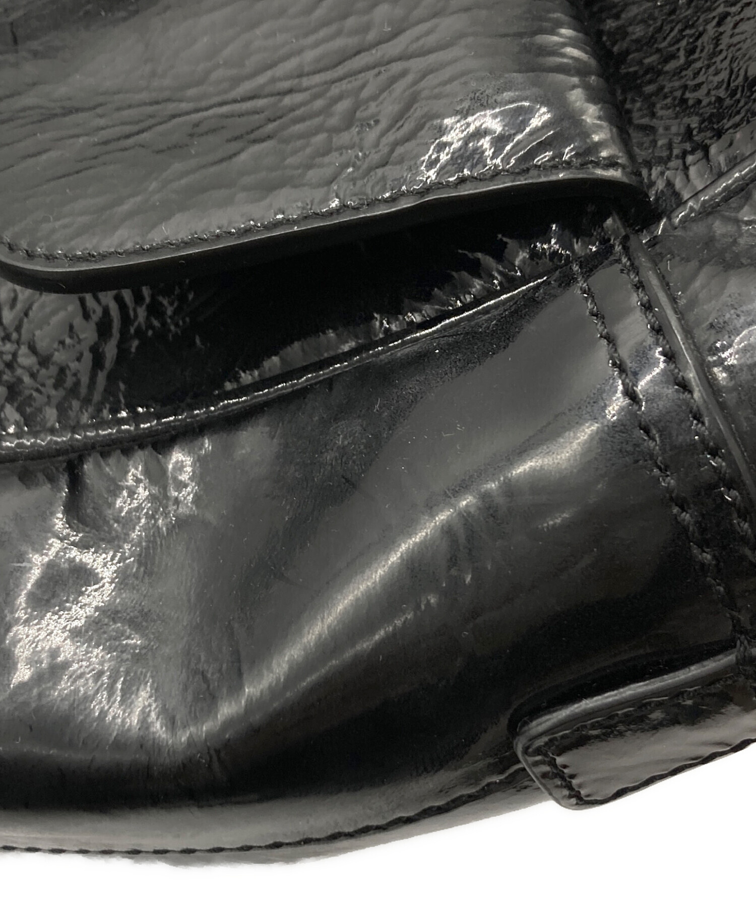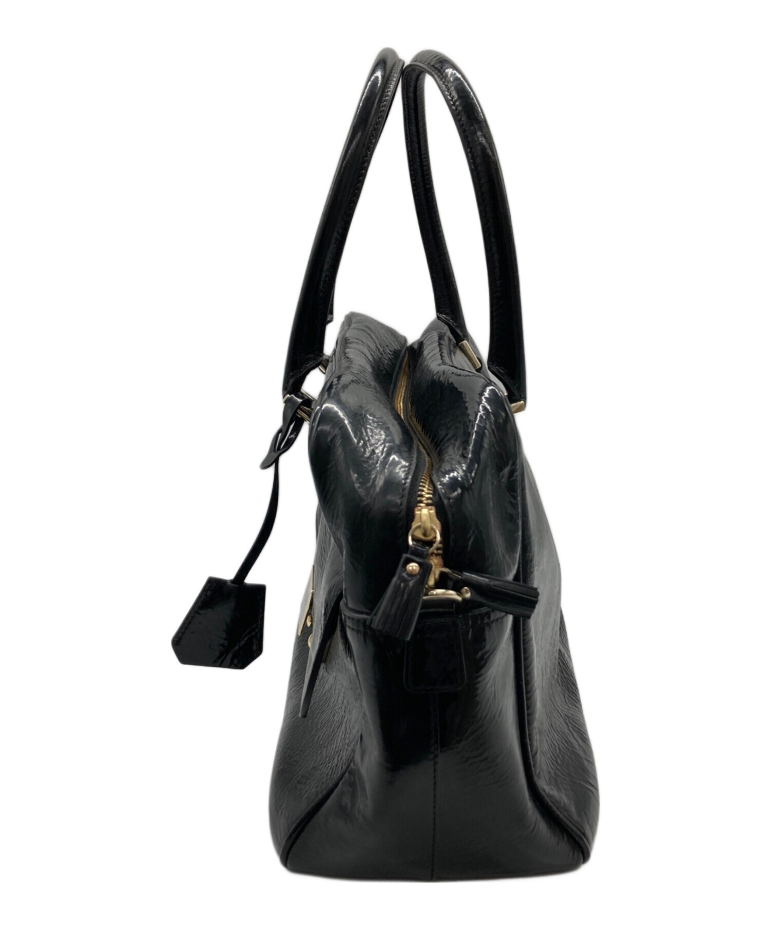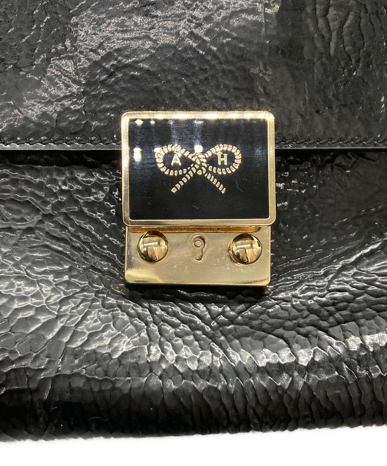 • ANYA HINDMARCH(アニヤ・ハインドマーチ)ANYA HINDMARCH (アニヤ・ハインドマーチ) エナメルスモールカーカーハンドバッグ ブラックの古着・服飾アイテム スレ有、ヨゴレ有