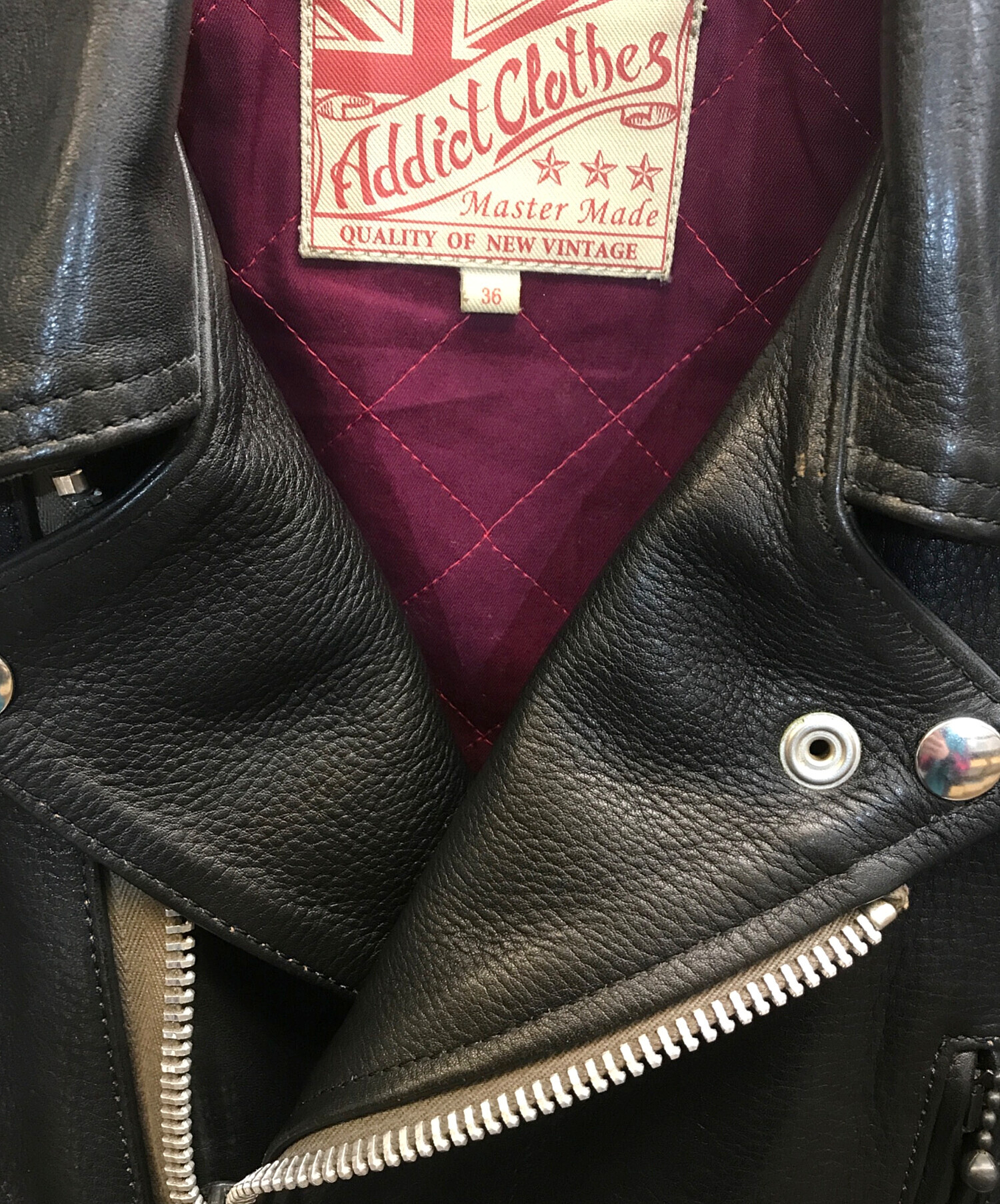 • ADDICT CLOTHES(アディクト クローズ)ADDICT CLOTHES (アディクト クローズ) ダブルライダースジャケット ブラック サイズ:36の古着・服飾アイテム 襟 ヨゴレ・スレ有