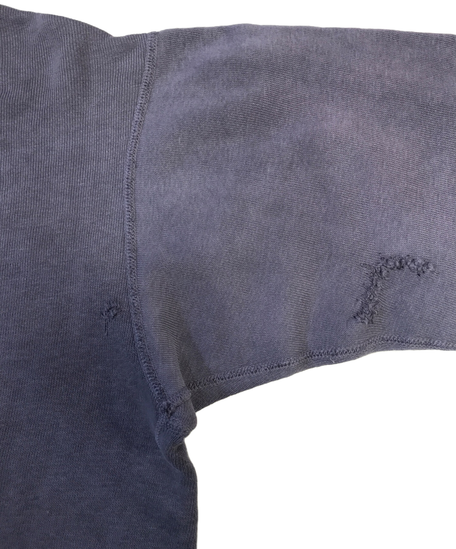 • Champion(チャンピオン)Champion (チャンピオン) 三段染み込みプリントスウェット パープル サイズ:MEDIUMの古着・服飾アイテム フロントダメージ・リペア