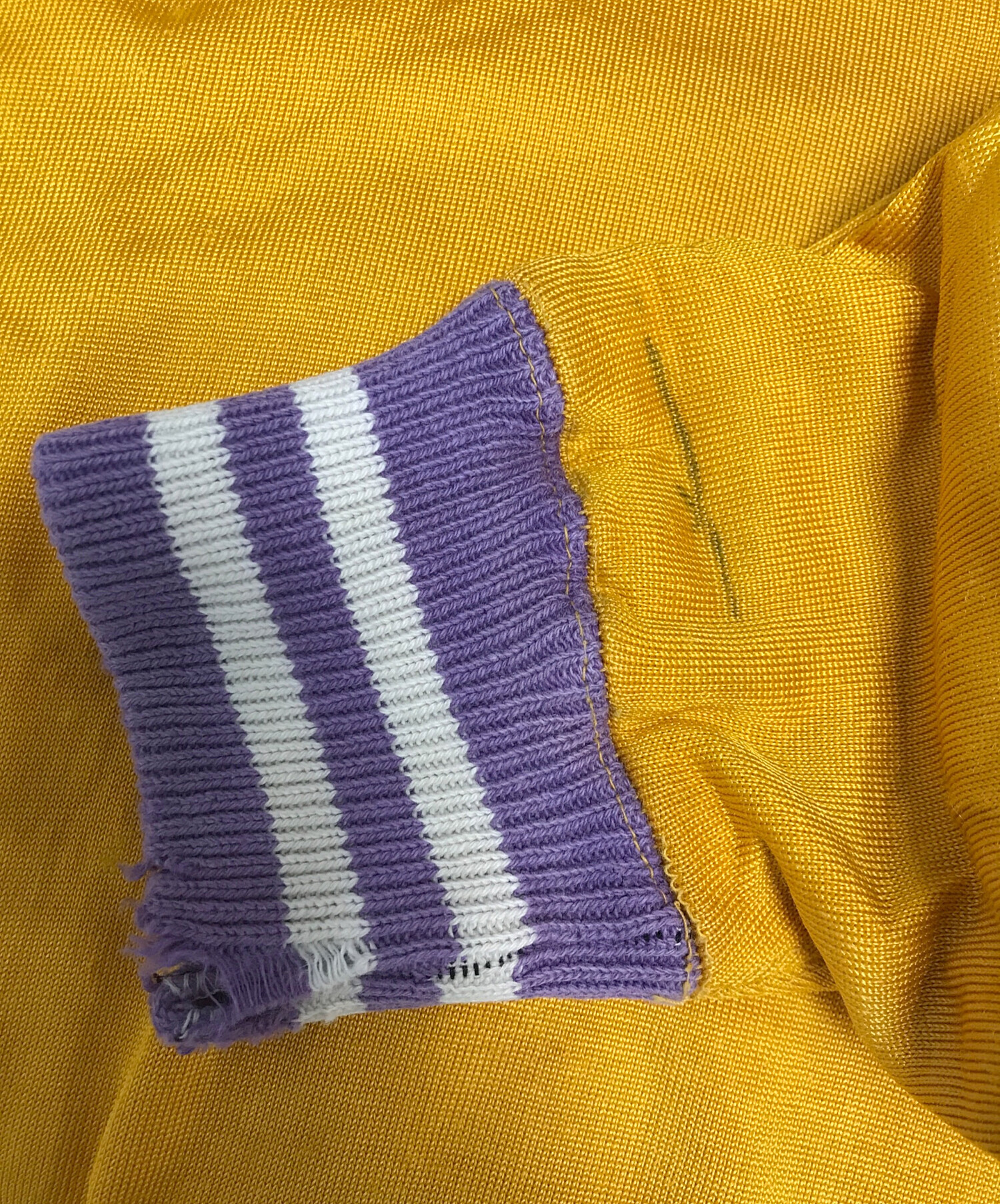 • Champion(チャンピオン)Champion (チャンピオン) ダブルフェイス リブラインスウェット イエロー×パープル サイズ:XLARGEの古着・服飾アイテム ヤブレ