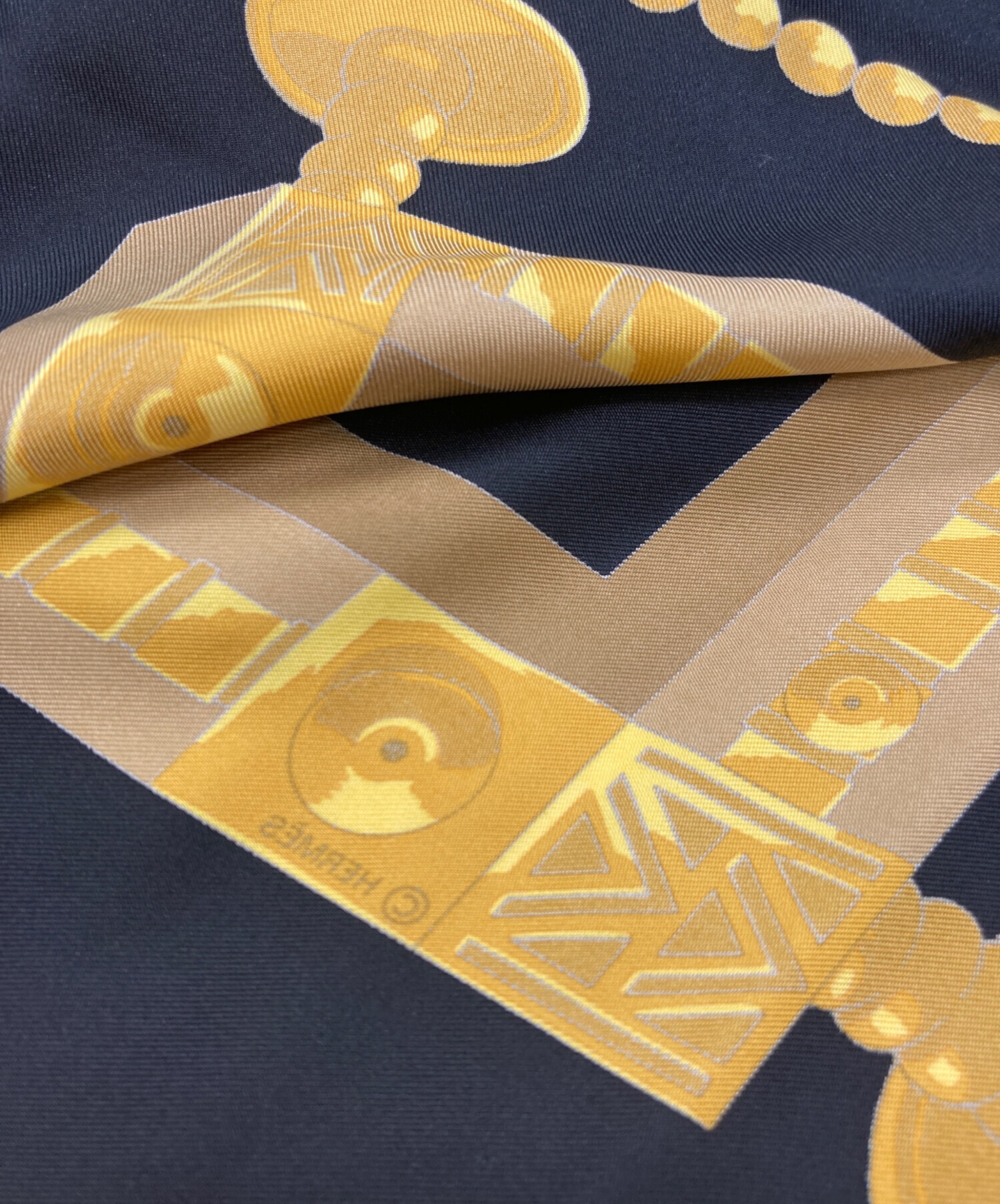 • HERMES(エルメス)HERMES (エルメス) カレ90 Eperon d'or 黄金の拍車 シルクスカーフ ブラックの古着・服飾アイテム 裏面小ヨゴレ