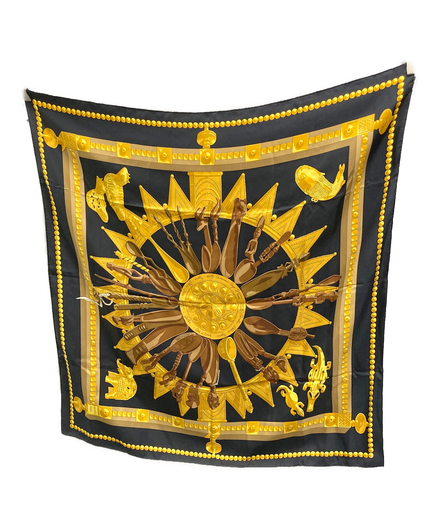• HERMES(エルメス)HERMES (エルメス) カレ90 Eperon d'or 黄金の拍車 シルクスカーフ ブラックの古着・服飾アイテム フロントヨゴレ