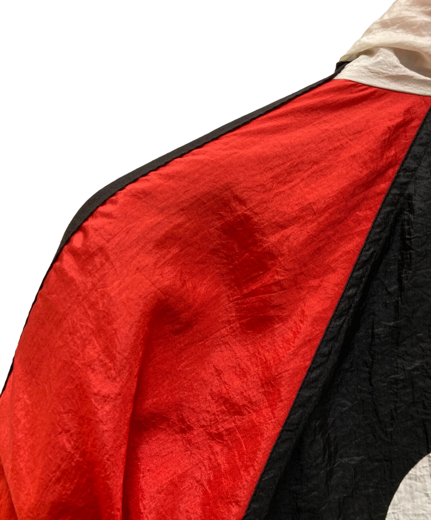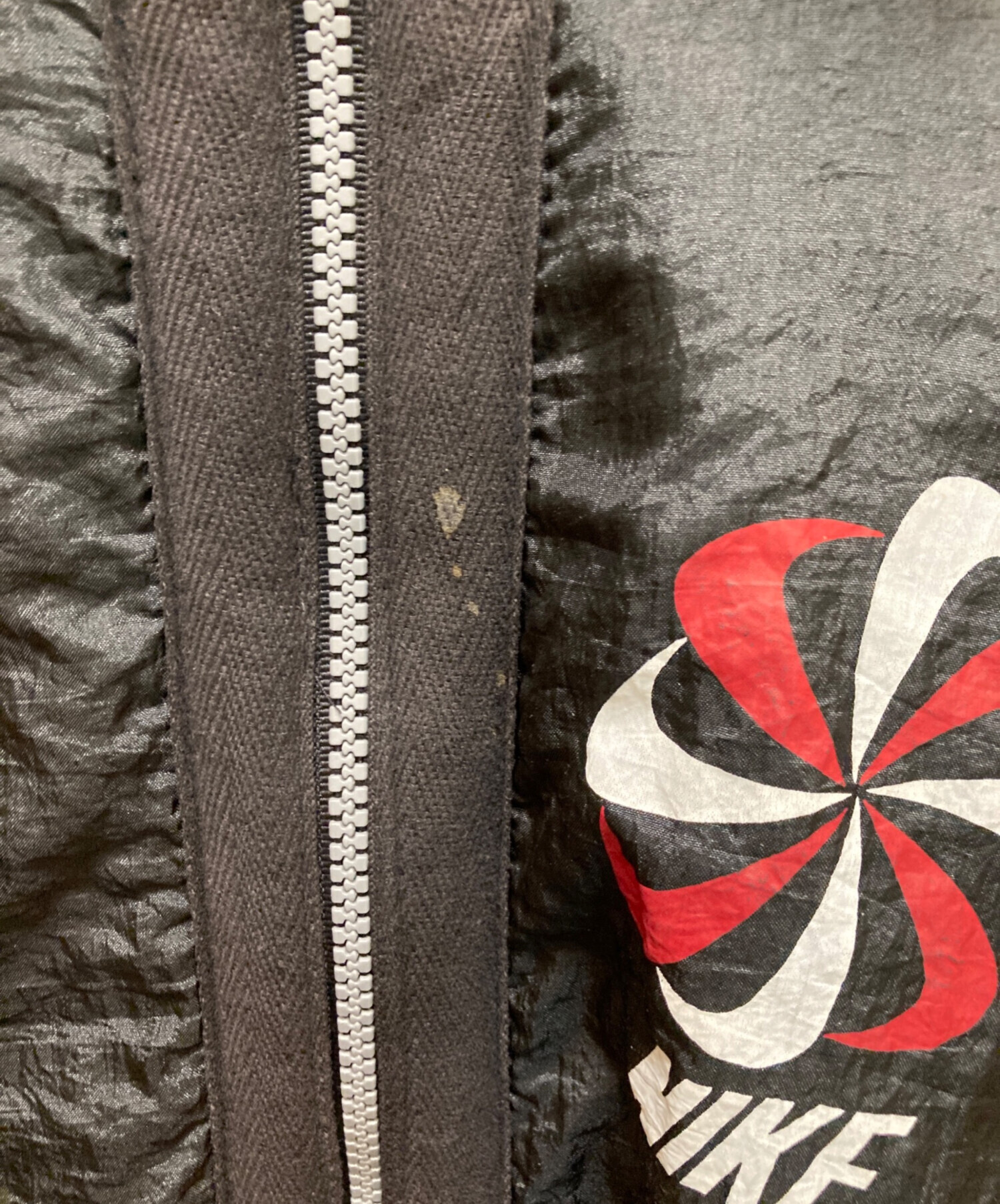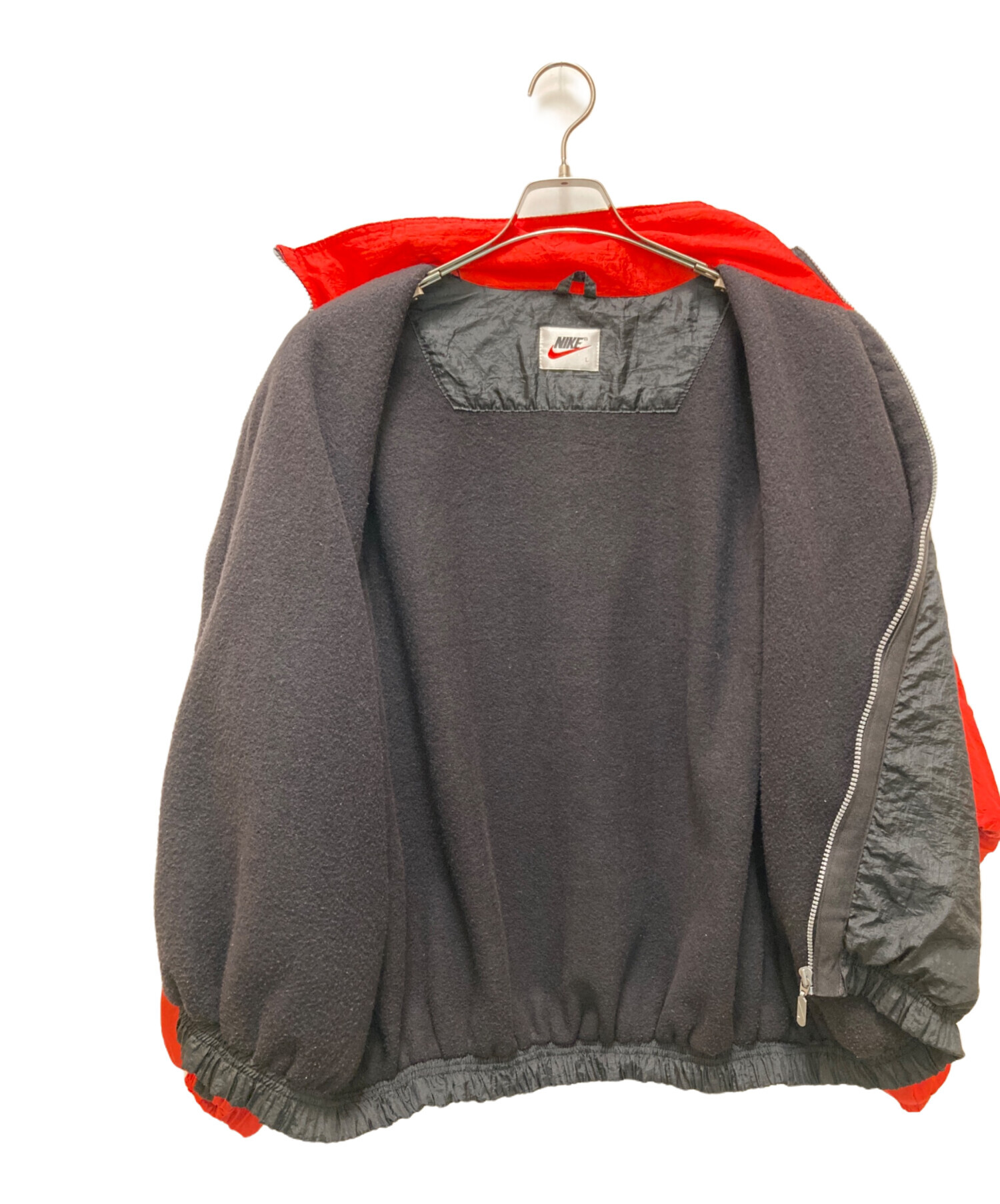 • NIKE(ナイキ)NIKE (ナイキ) ヴィンテージ風車ロゴプリントジャケット レッド×ブラック サイズ:Ⅼの古着・服飾アイテム ヨゴレ有