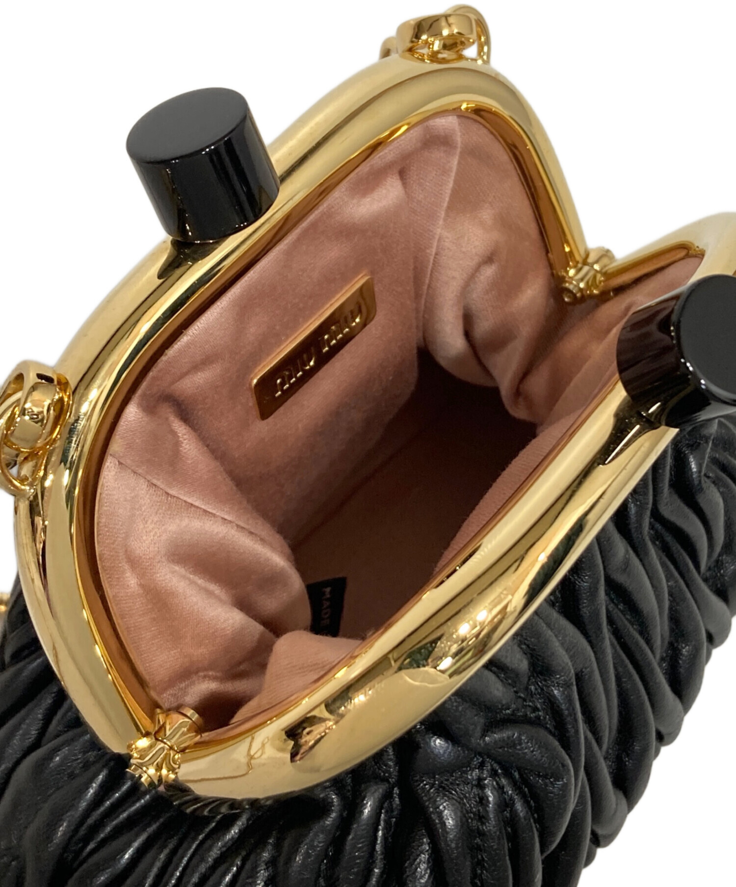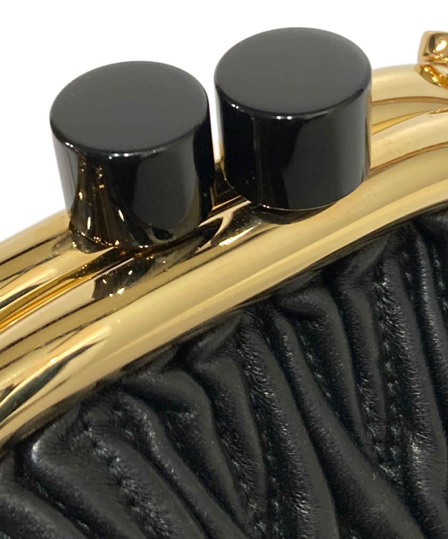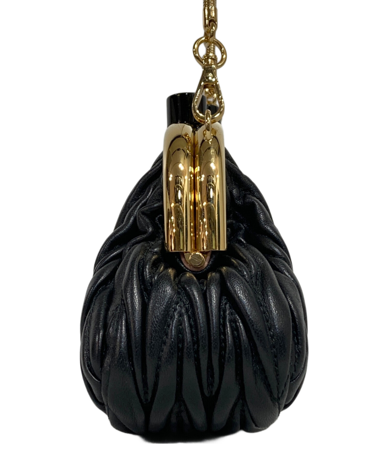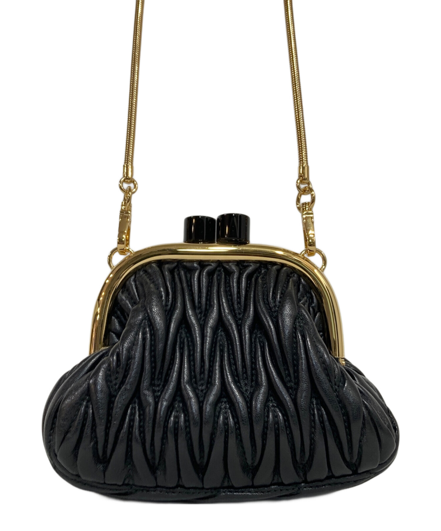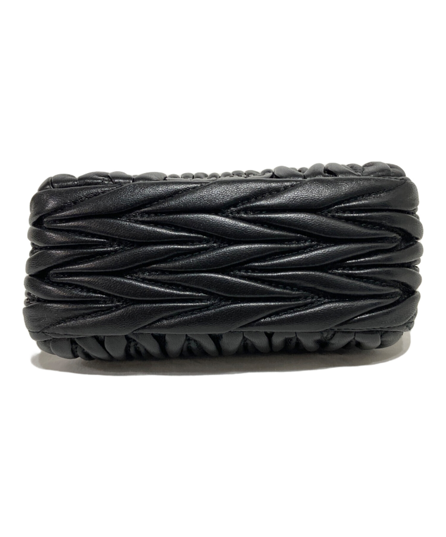 | スタッフコメント | MIU MIUのアイコンであるマテラッセモチーフのアイテム。 黒を基調にしたカラーにゴールドの金具が特徴のコンパクトなバッグです。 |