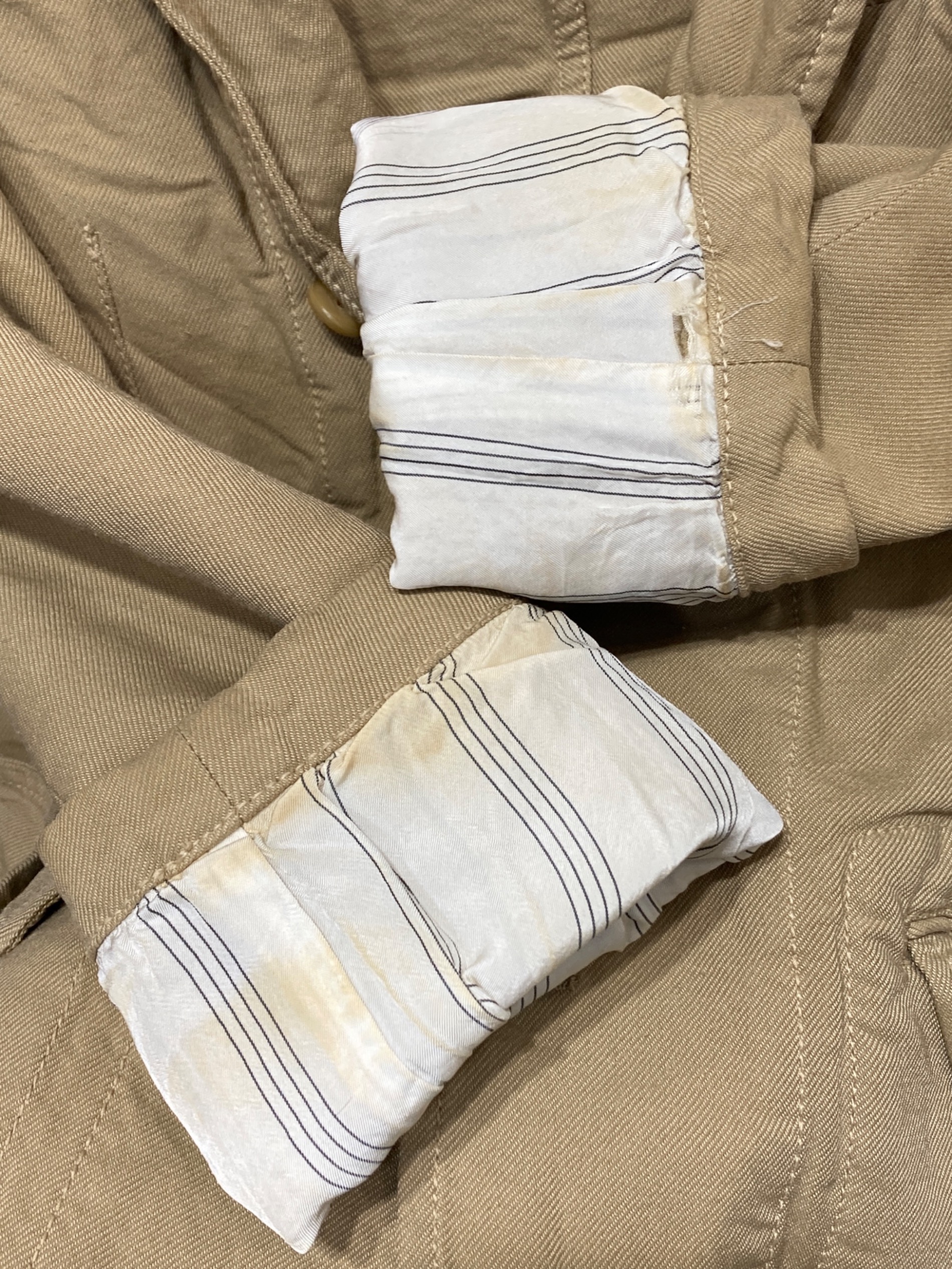 | 状態 | 袖口スレ、ヨゴレ、ヤブレダメージがございます。 襟スレ、ヨゴレがございます。袖シミヨゴレがございます。 各所スレ、ヨゴレ、毛羽立ちなどの使用感がございます。 こちらの商品は中古品の為、使用に伴います細かなキズ、汚れがございます。店頭にて展示販売を行っている為、記載に無い細かなキズ、汚れが見受けられる場合がございます。 |