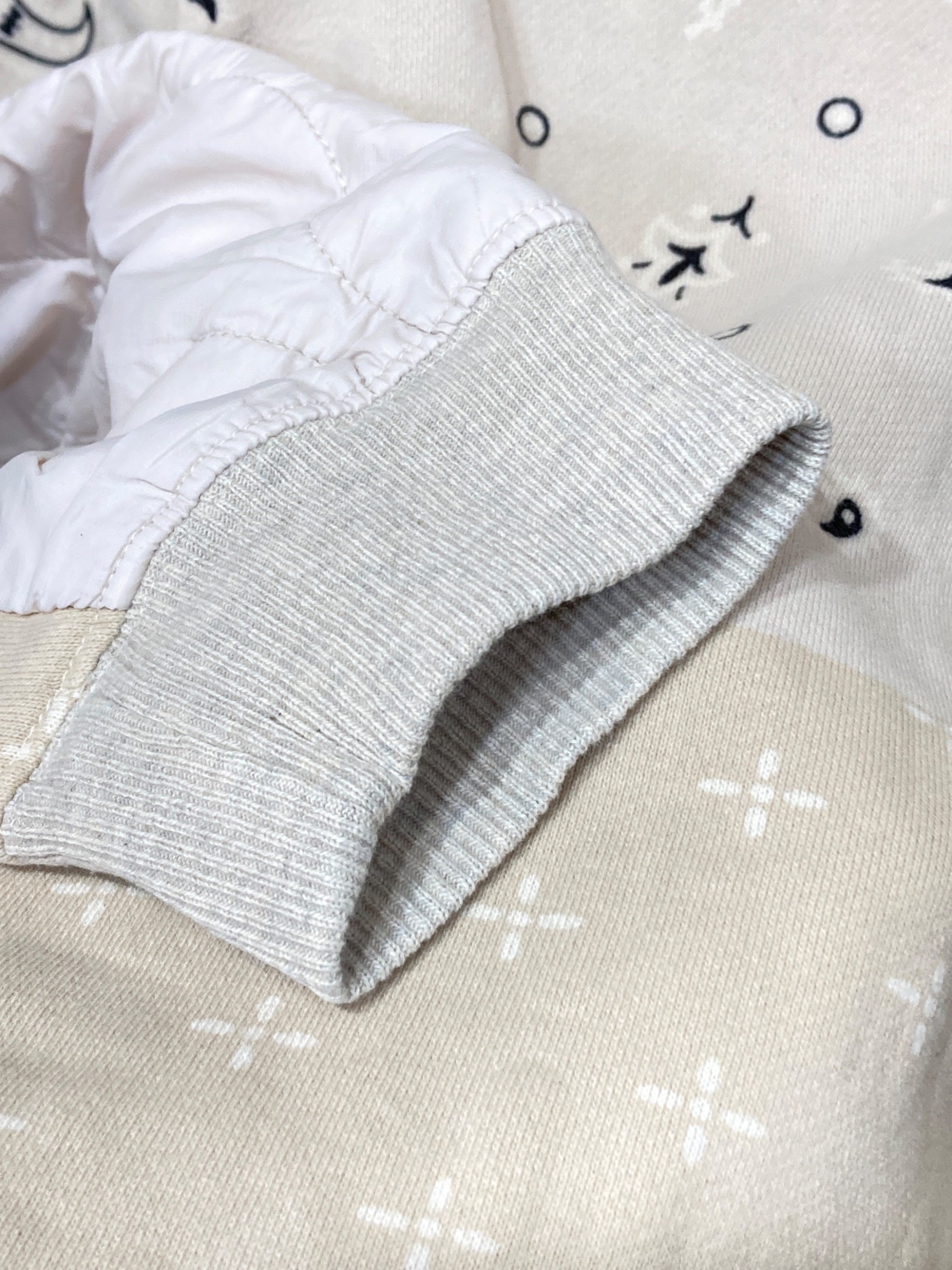| 素材 | 綿 100% 後身頃: ポリエステル 100% 後身裏地: 綿 100% 中綿: ポリエステル 100% リブ部分: 綿 100% |