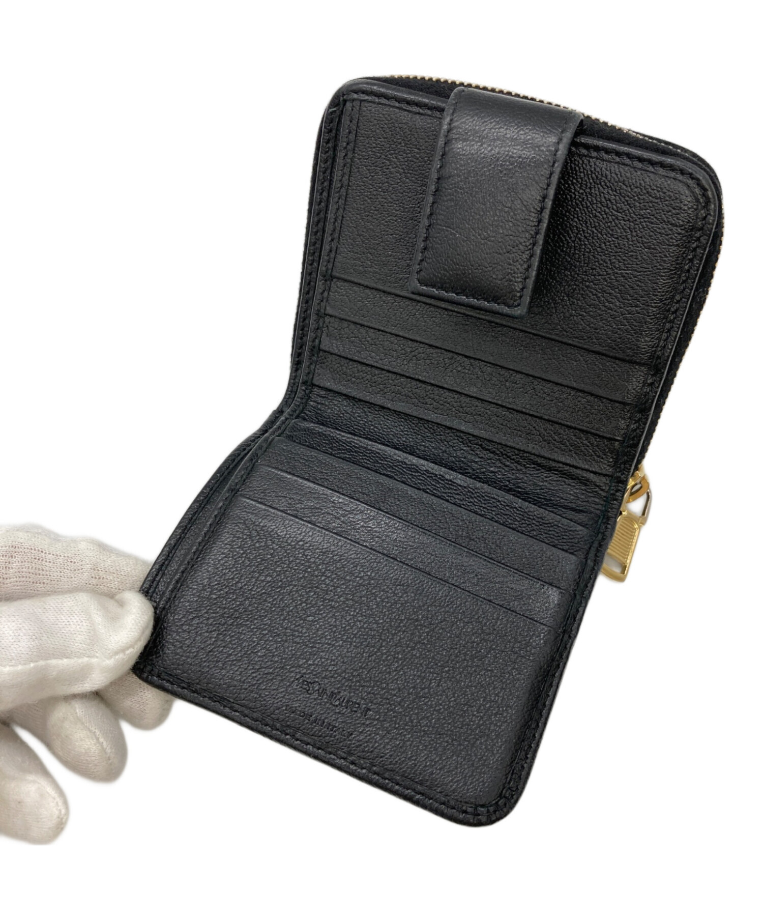 | スタッフコメント | ブラック×ゴールドとシンプルな2つ折り財布です。 YSLのロゴが本体と同色ながら、かなりの存在感があります。 |