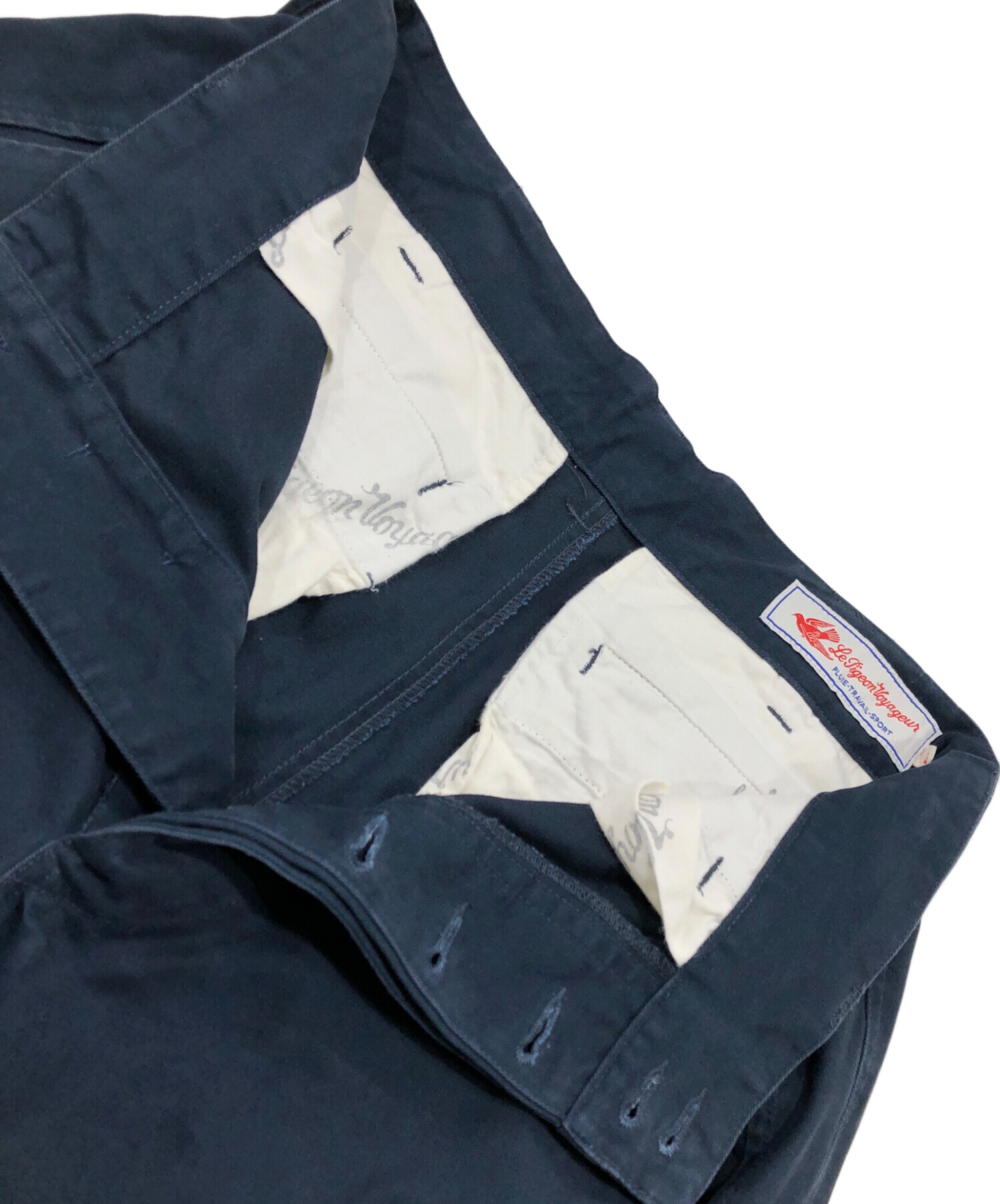• Le Pigeon Voyageur(ル ピジョン ヴォワイヤジュール)Le Pigeon Voyageur (ル ピジョン ヴォワイヤジュール) カーゴパンツ ネイビー サイズ:Mの古着・服飾アイテム 背面全体スレ有