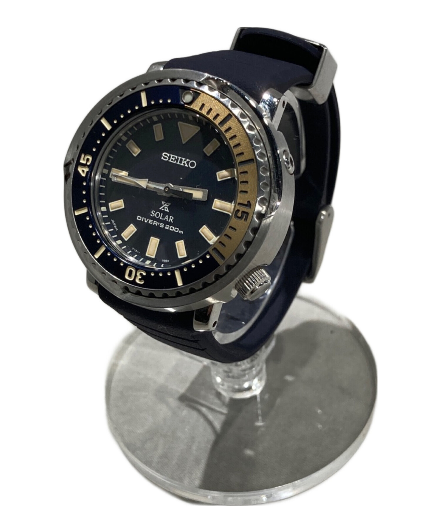 | スタッフコメント | ソーラー充電機能を搭載した200m潜水用防水の本格的なダイバーズウォッチです。特徴的な「ミニミニツナ」デザインとネイビーのシリコンバンドにより、高い機能性とカジュアルなスタイルを両立しています。 |