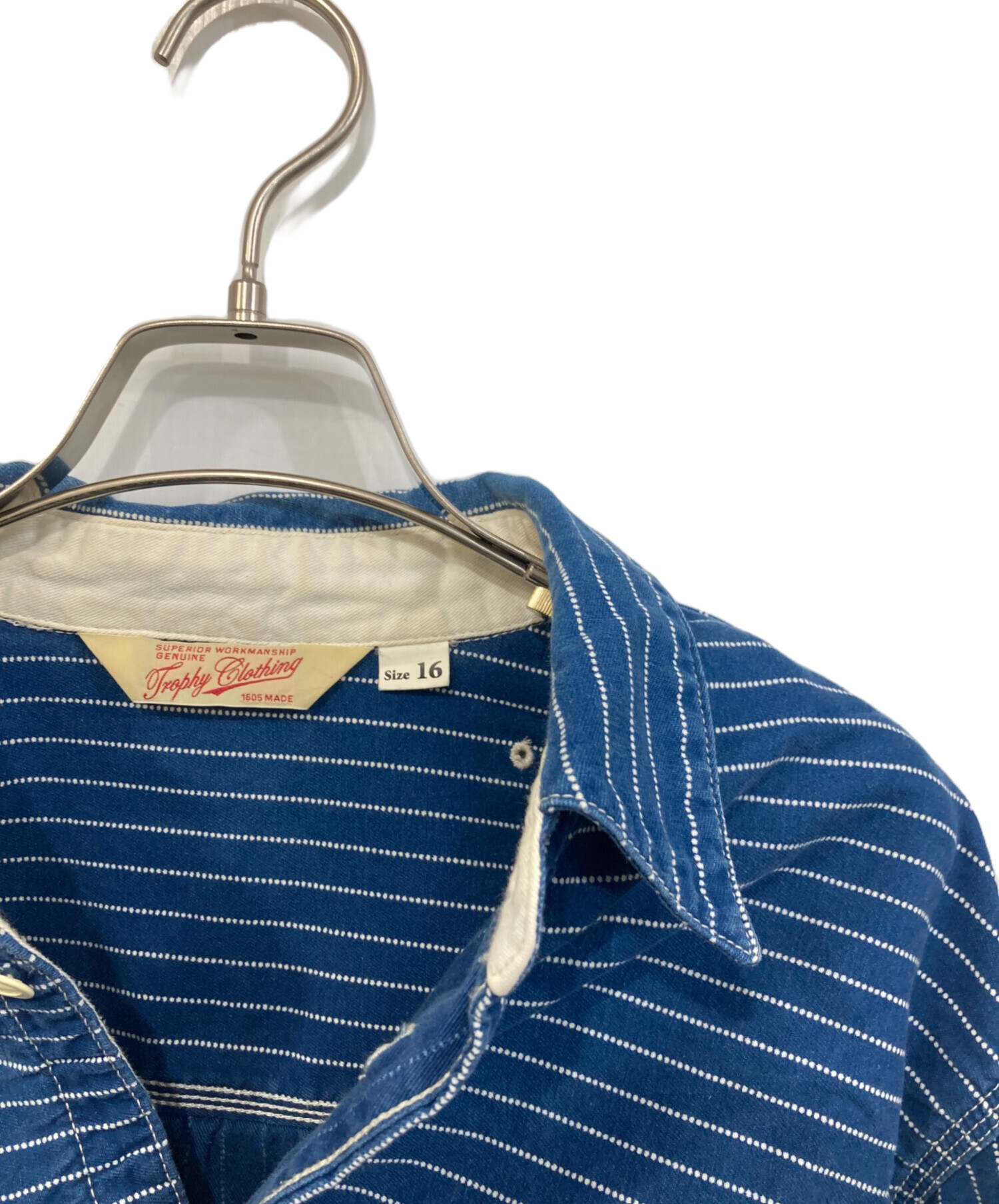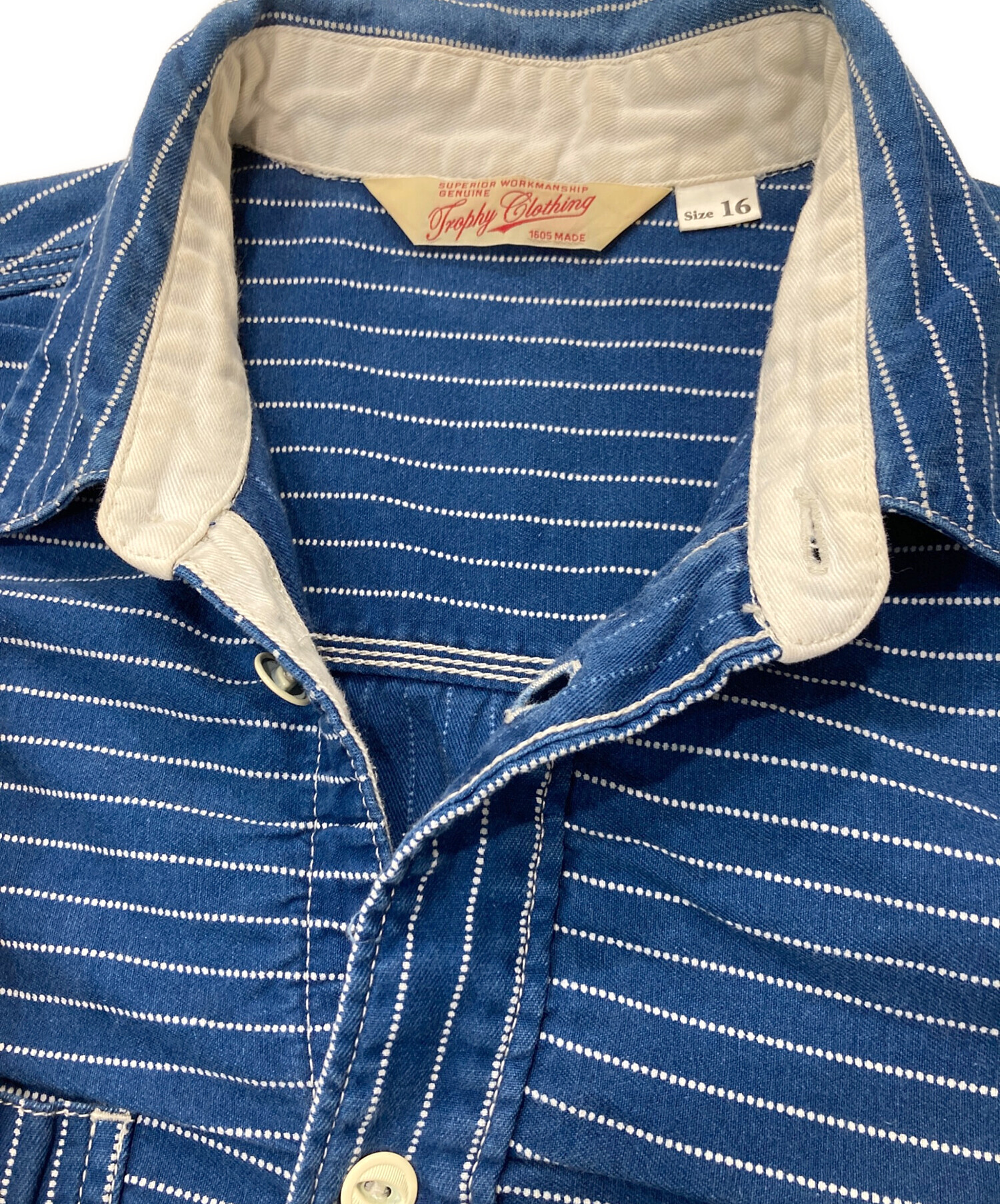 • Trophy Clothing(トロフィークロージング)Trophy Clothing (トロフィークロージング) ドットウォバッシュ デニムシャツ インディゴ サイズ:16の古着・服飾アイテム 襟ヨゴレ