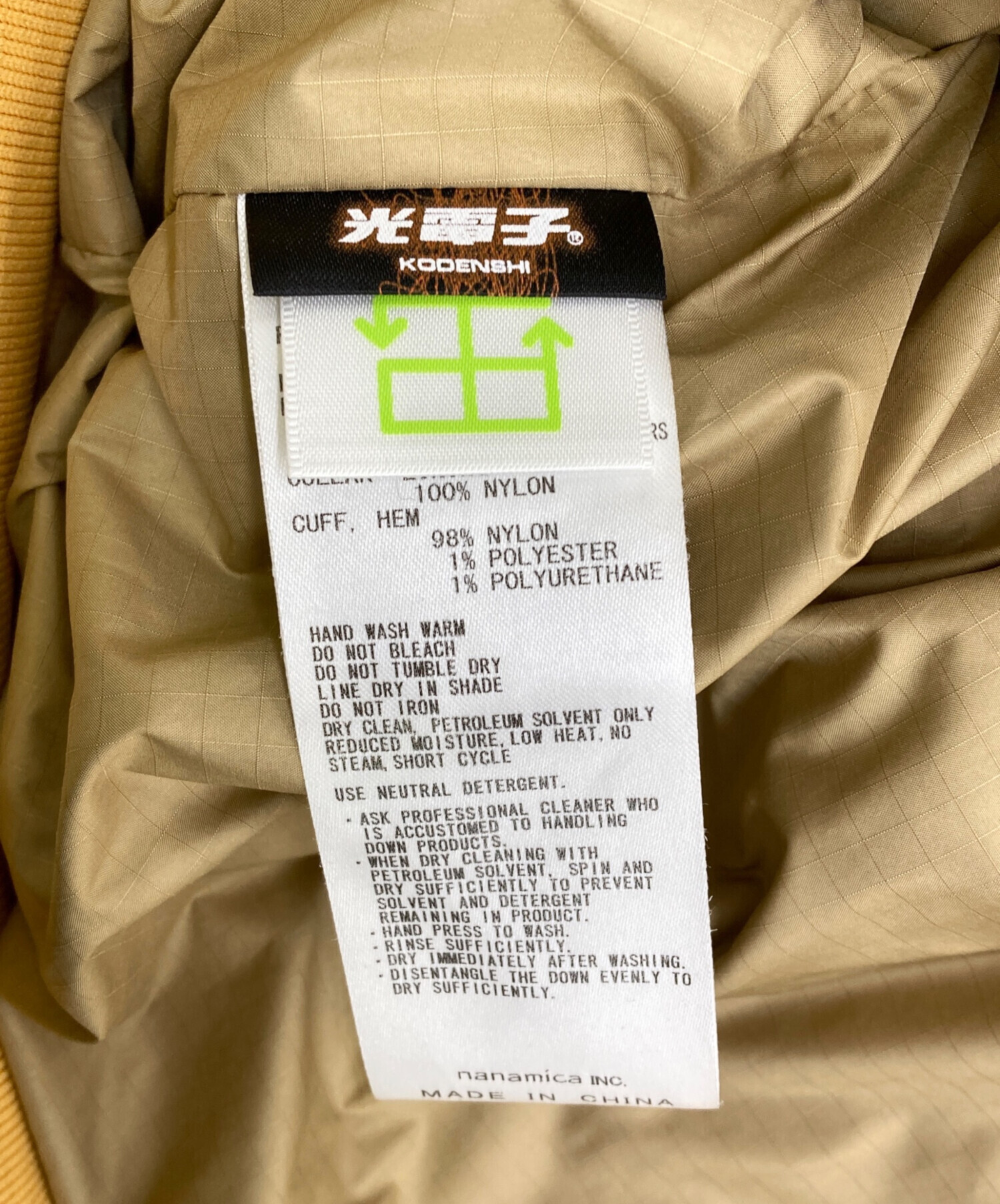 | 素材 | 表地:ポリエステル 65% 綿 35% 裏地:ポリエステル 100% 中綿:ダウン72% レーヨン20% フェザー8% 衿裏:ナイロン100% 袖口、裾:ナイロン98% ポリエステル1% ポリウレタン1% |