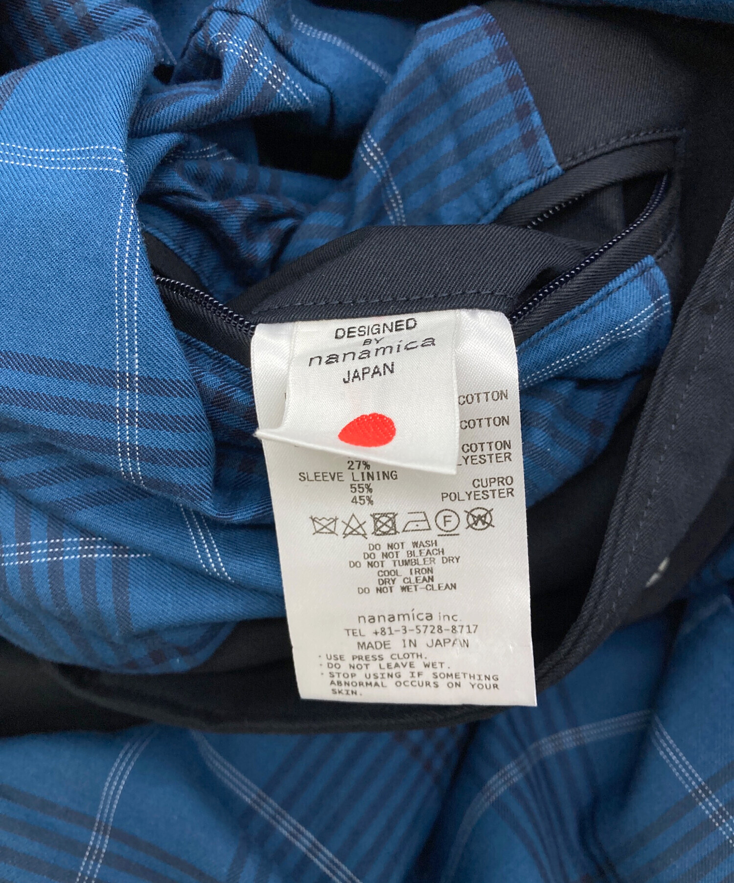 | 素材 | 表地:綿 袖口見返し:綿 身頃裏:綿73% ポリエステル27% 袖裏:キュプラ55% ポリエステル45% |