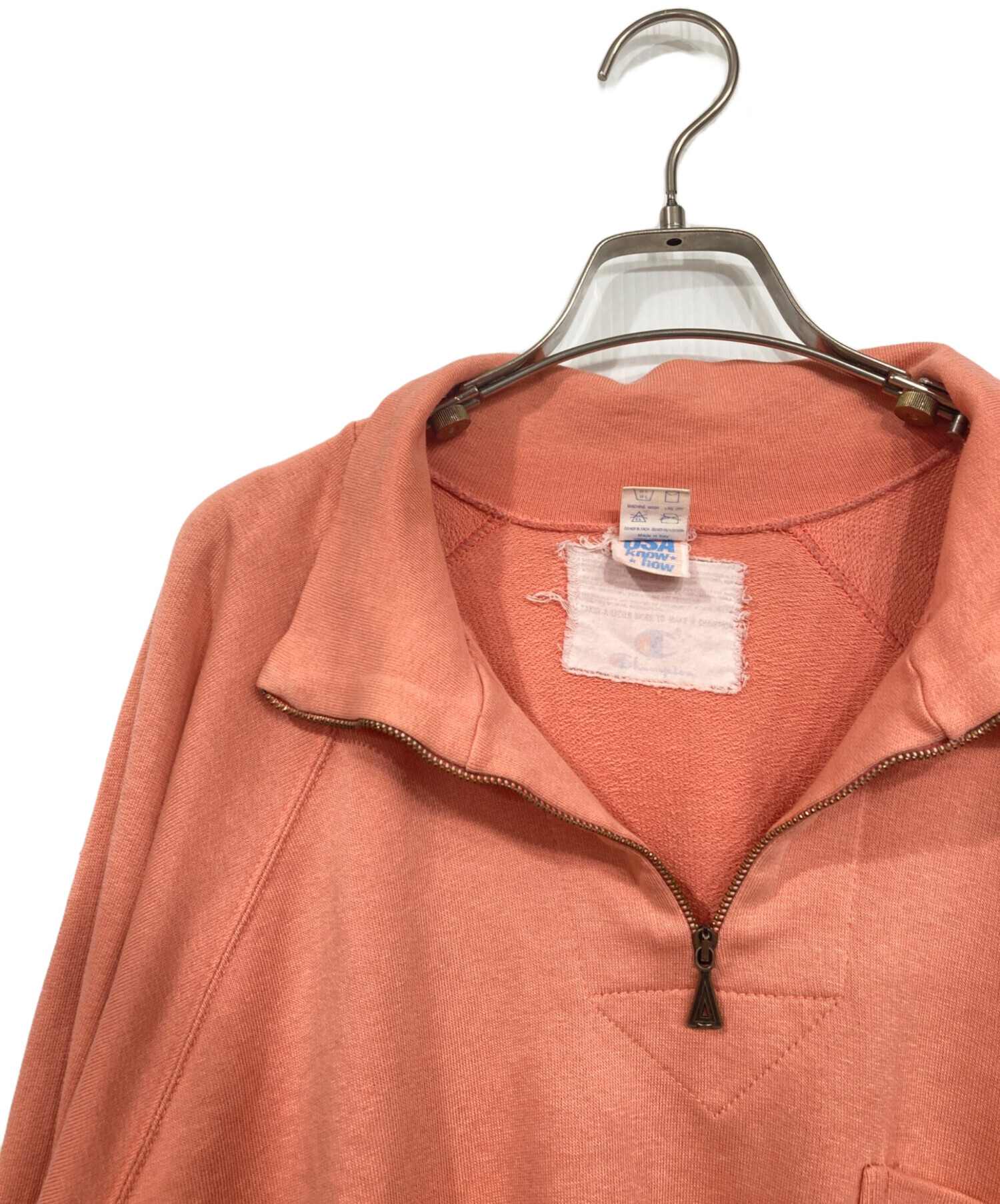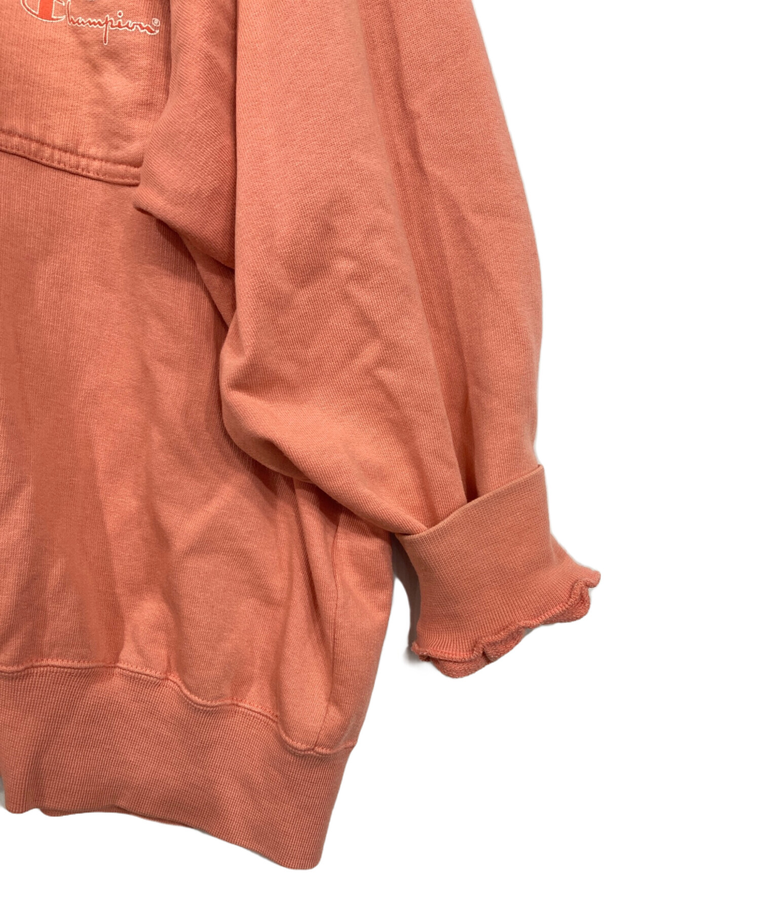 • Champion(チャンピオン)Champion (チャンピオン) ハーフジップスウェット ピンク サイズ:XLの古着・服飾アイテム 首元ダメージ