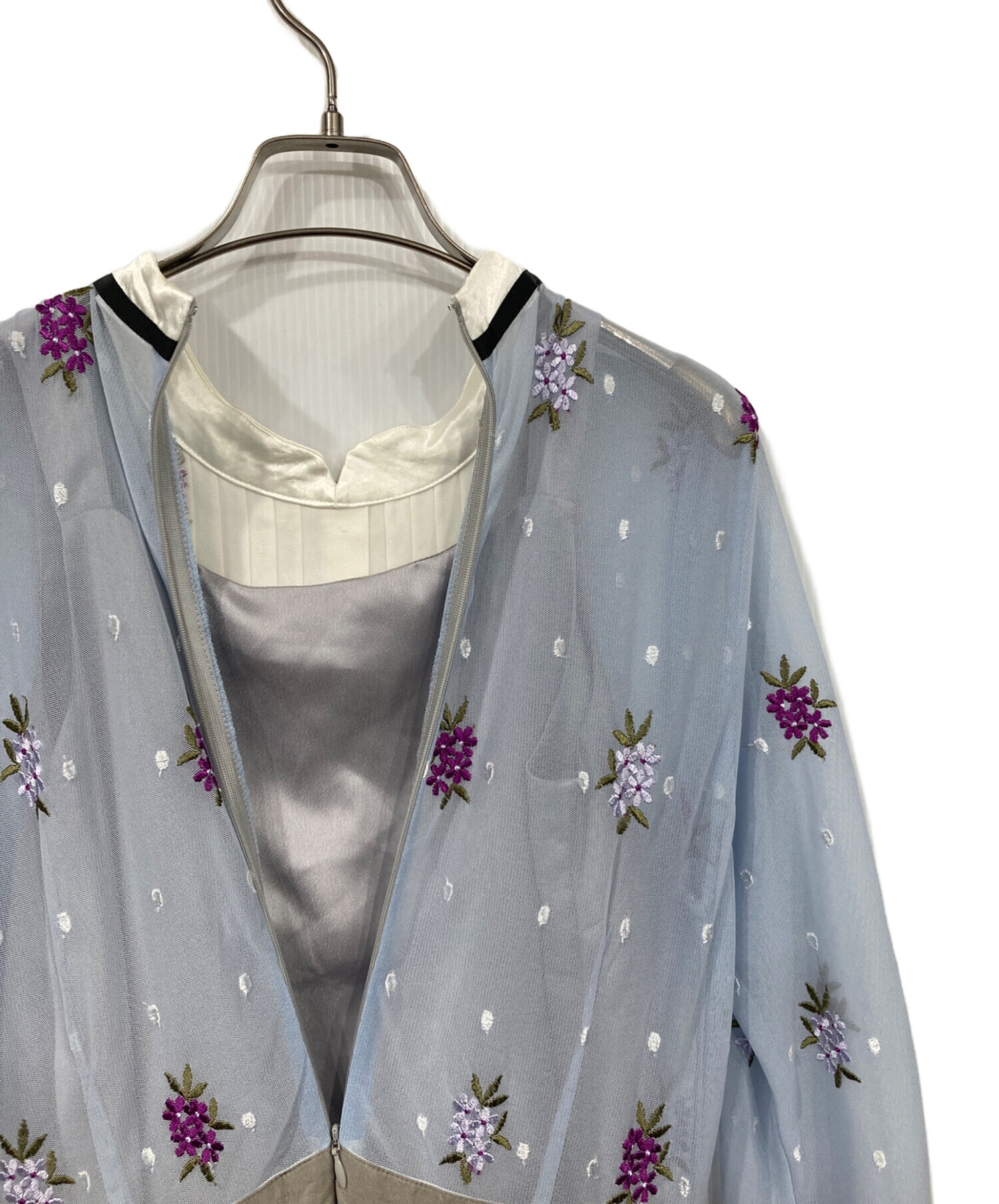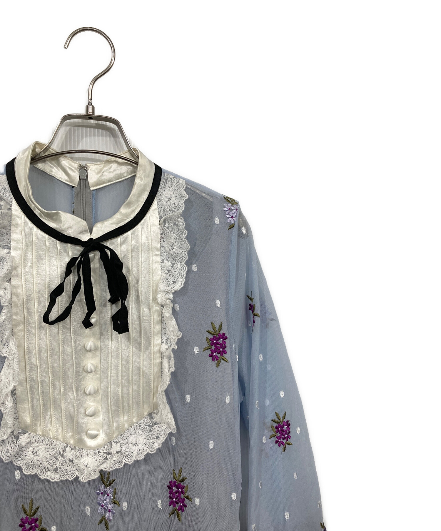 | 素材 | 表地: ポリエステル 100% 表刺繍糸: レーヨン 100% 裏刺繍糸: ポリエステル 100% 袖部分: ポリエステル 100% 前ピンタック部分: アセテート 100% 裏地: ポリエステル 100% |