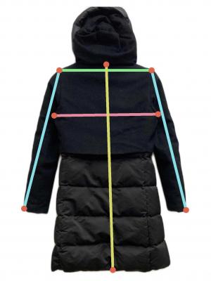 | 素材 | 表地1 毛 42% レーヨン 40% ポリエステル 18% 表地2 ポリエステル 100% 裏地1 ナイロン 100% 裏地2 ナイロン 52% ポリエステル 48% 中綿 ダウン 85% フェザー 15% |