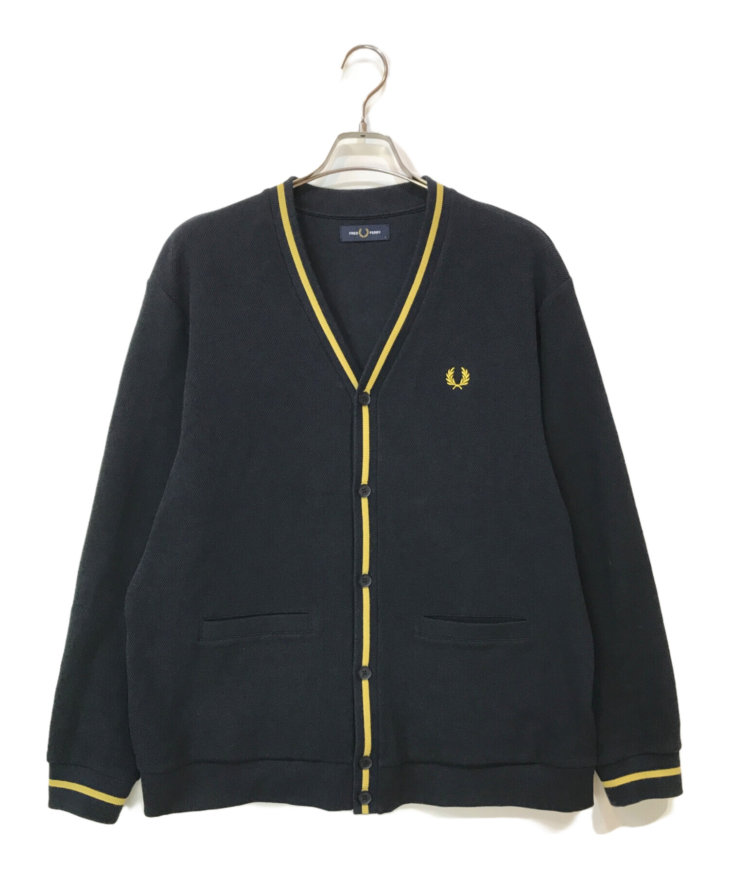 • FRED PERRY(フレッドペリー)FRED PERRY (フレッドペリー) TIPPED PIQUE TEXTURE CARDIGAN ネイビー サイズ:Lの古着・服飾アイテム 袖シミ