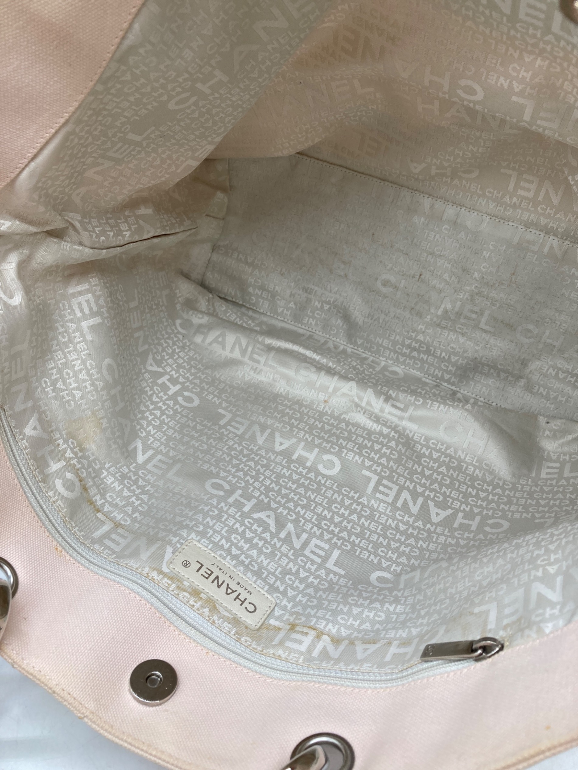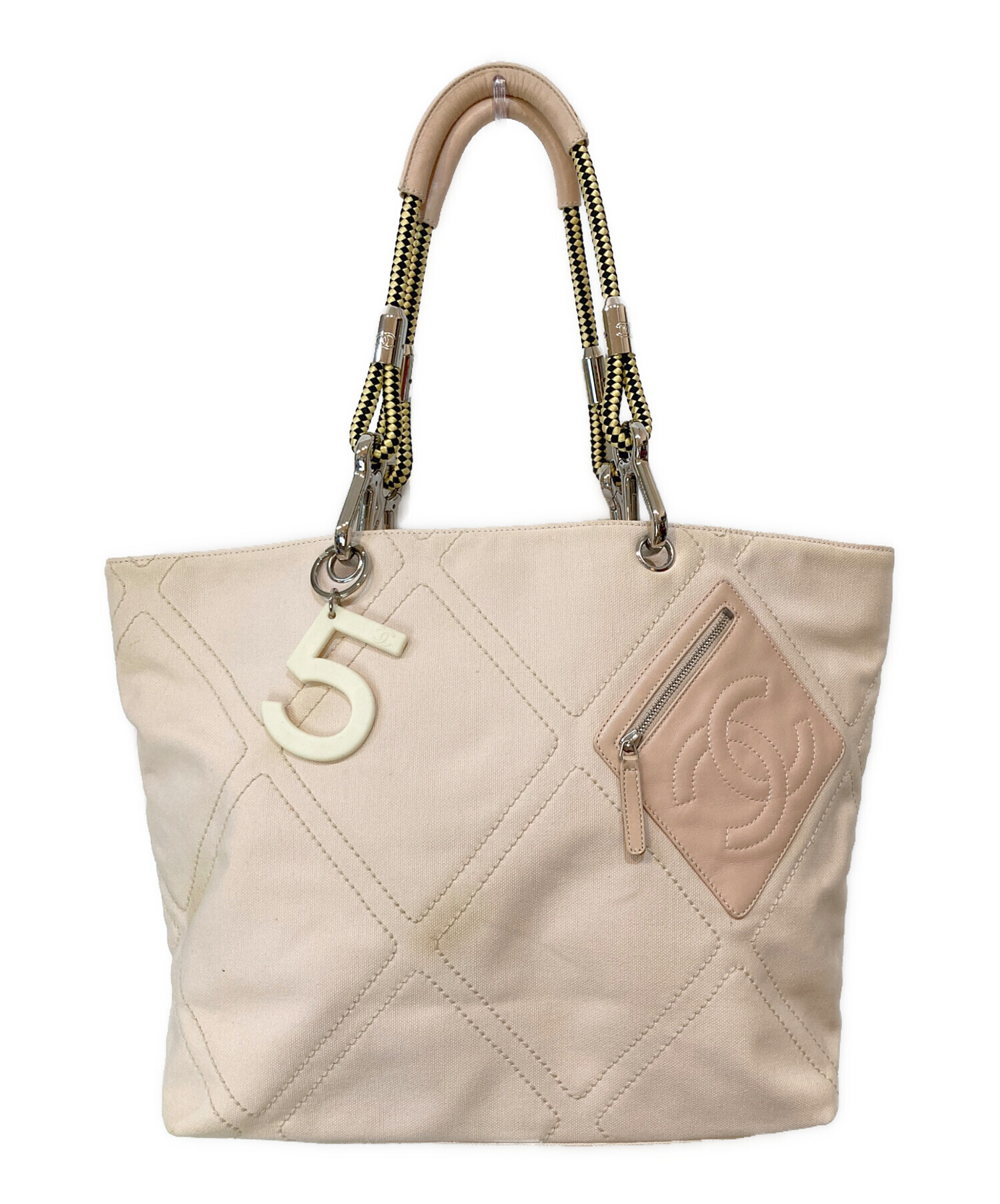 • CHANEL(シャネル)CHANEL (シャネル) No.5 ココマーク ロープ トートバッグ ピンク サイズ:-の古着・服飾アイテム 金具・ファスナー引手スレ