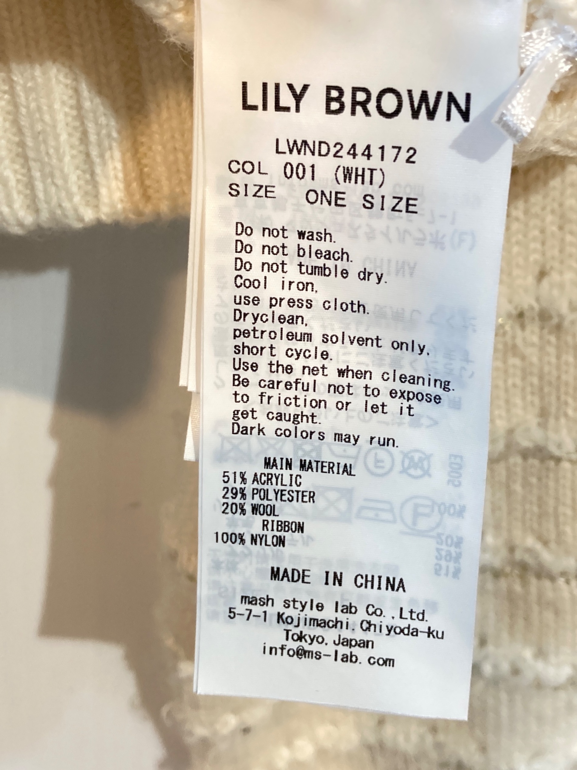 | 素材 | アクリル 51% ポリエステル 29% 羊毛 20% リボン部分 ナイロン 100% |