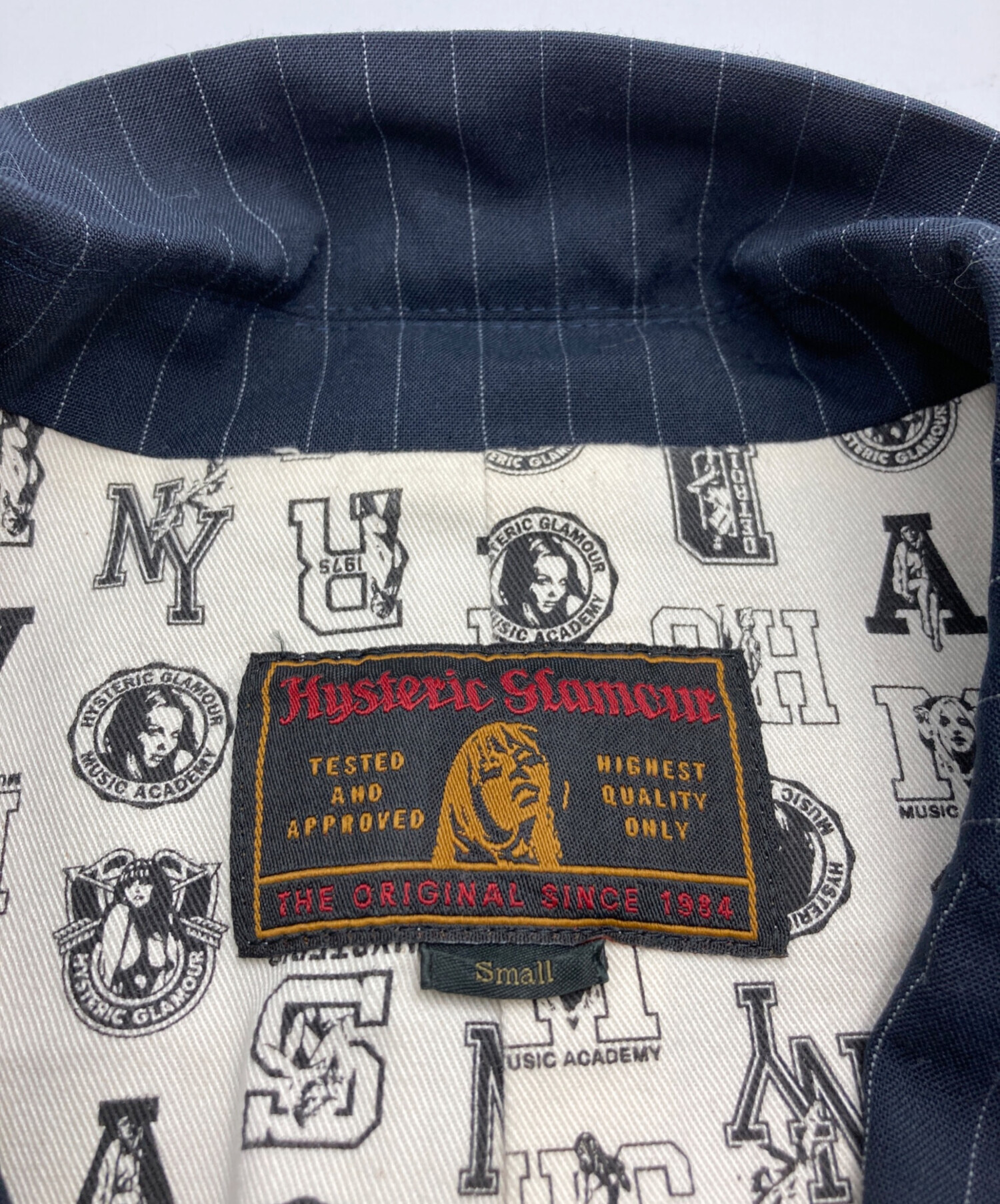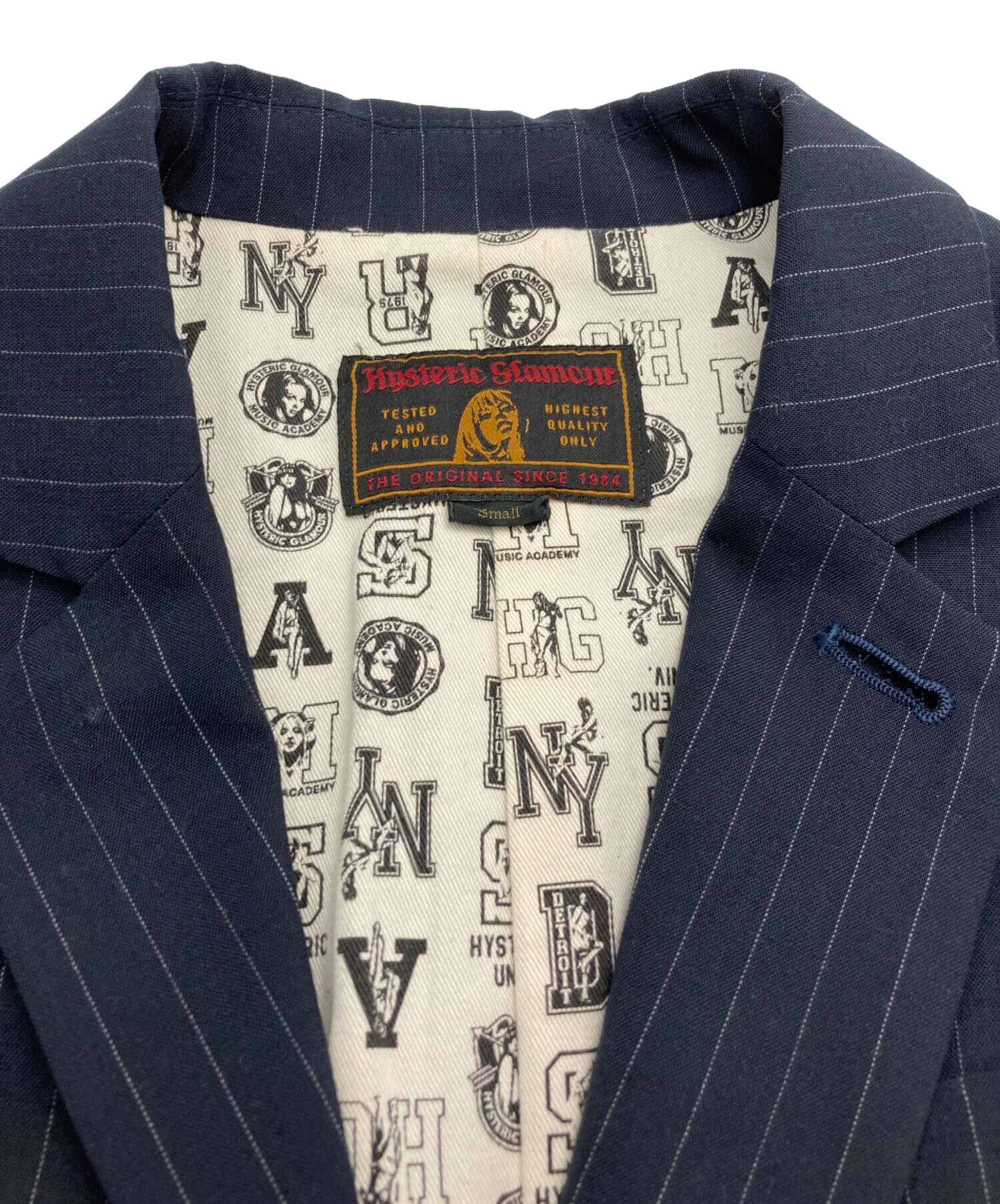 • Hysteric Glamour(ヒステリックグラマー)Hysteric Glamour (ヒステリックグラマー) ストライプテーラードジャケット ネイビー サイズ:Sの古着・服飾アイテム シミ
