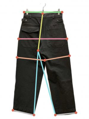 ウエスト周り約75cm ヒップ周り約107cm もも周り約61.5cm 裾周り約42cm 股上(後ろ)約37.5cm 股下(後ろ)約66cm