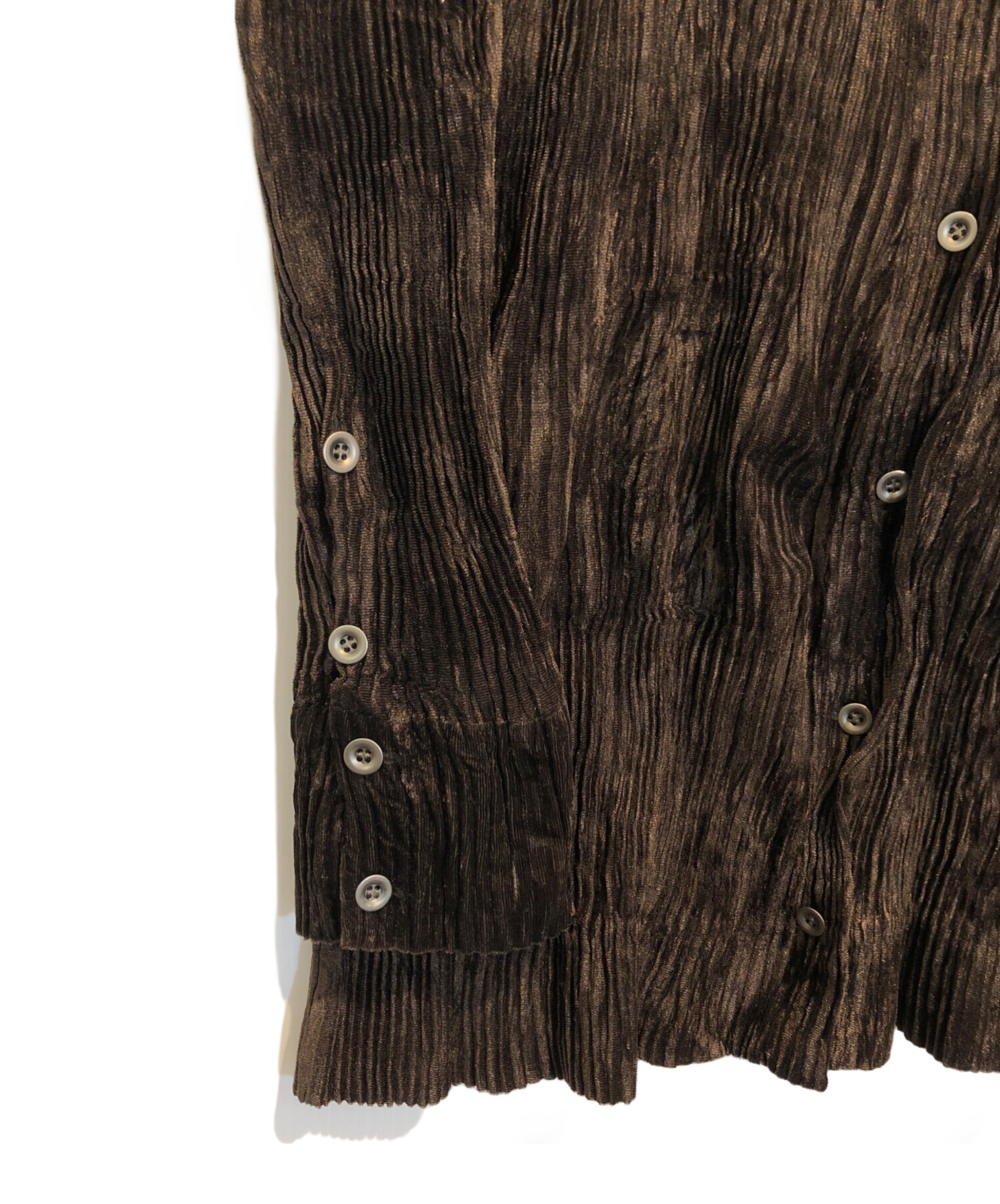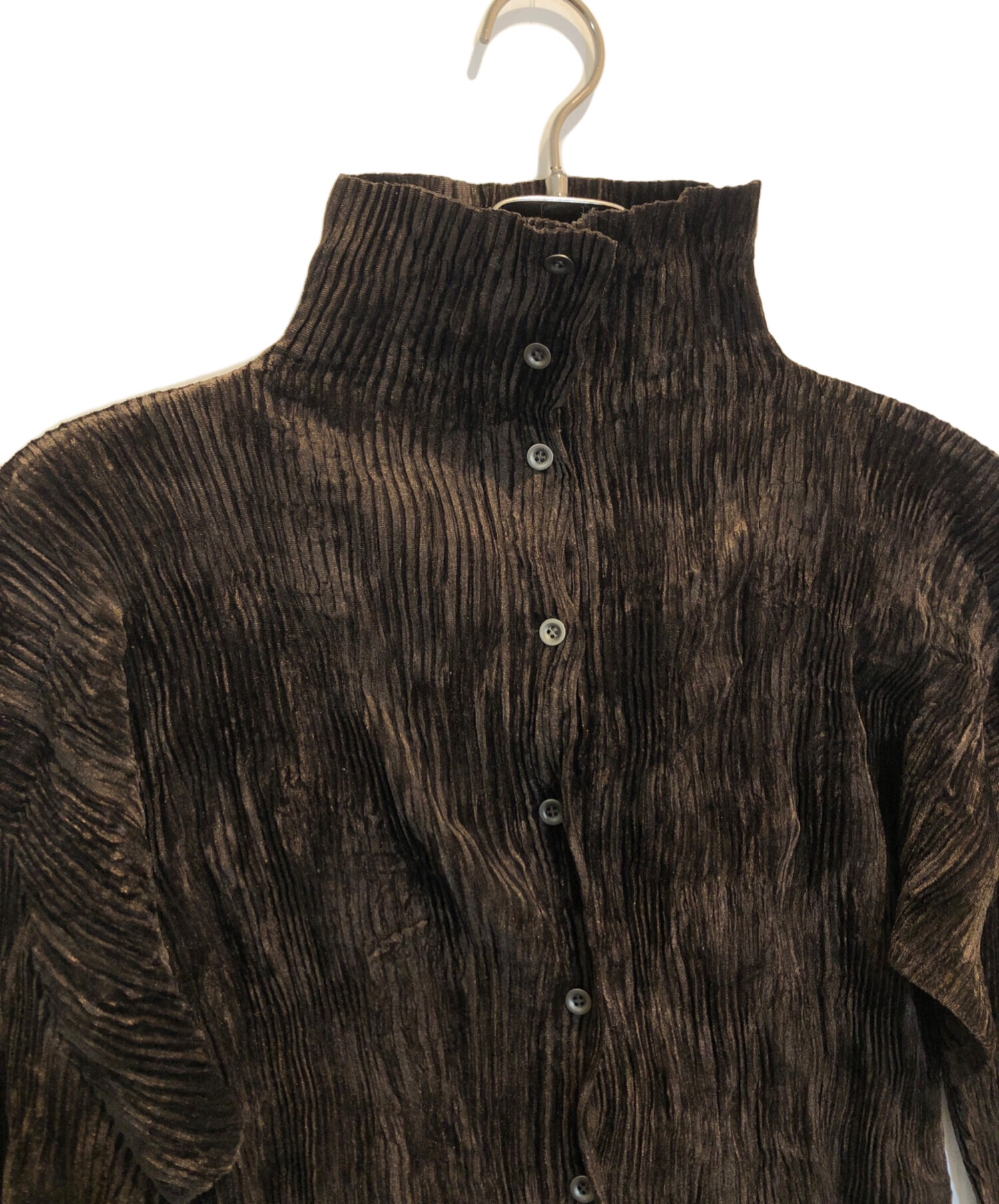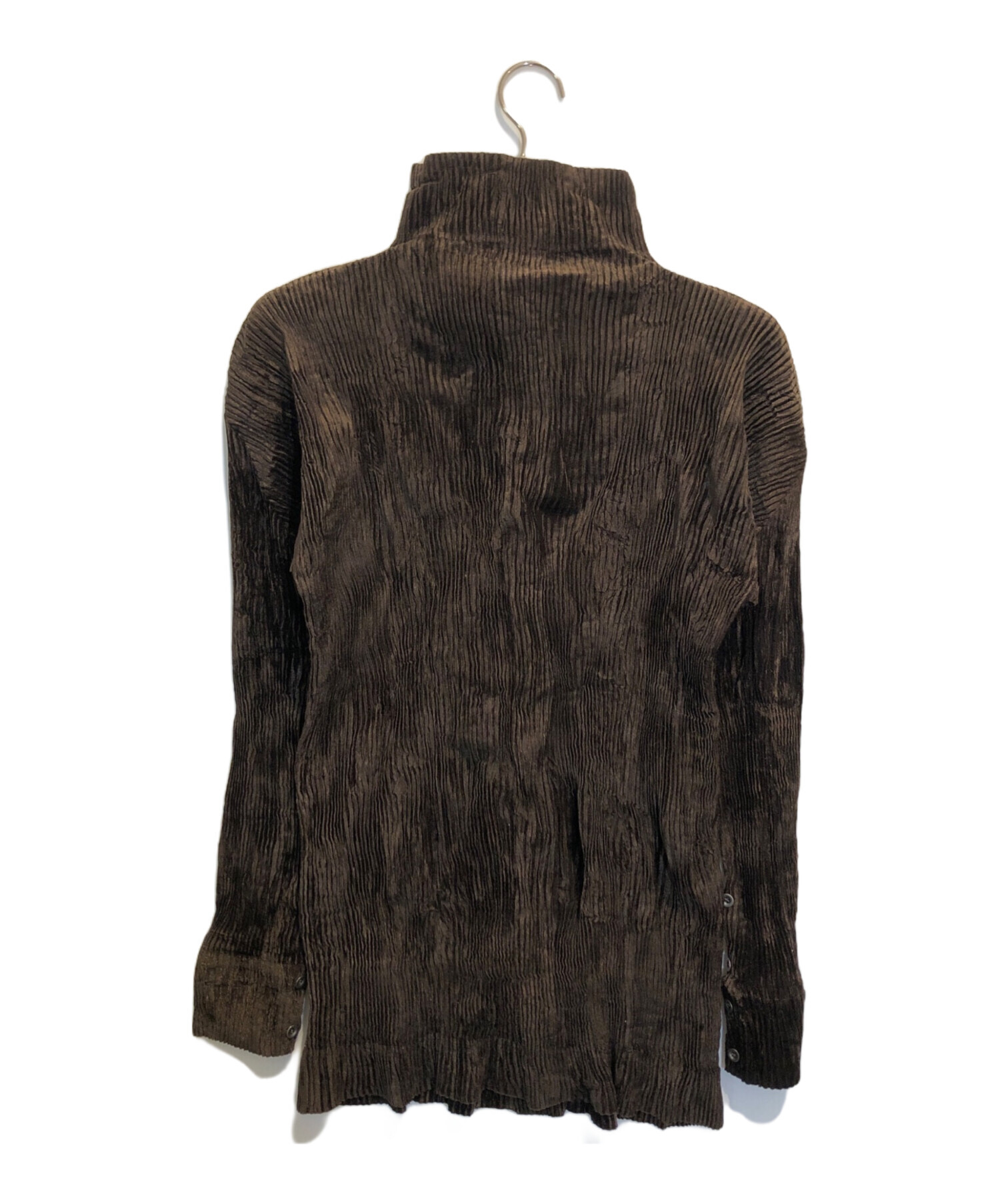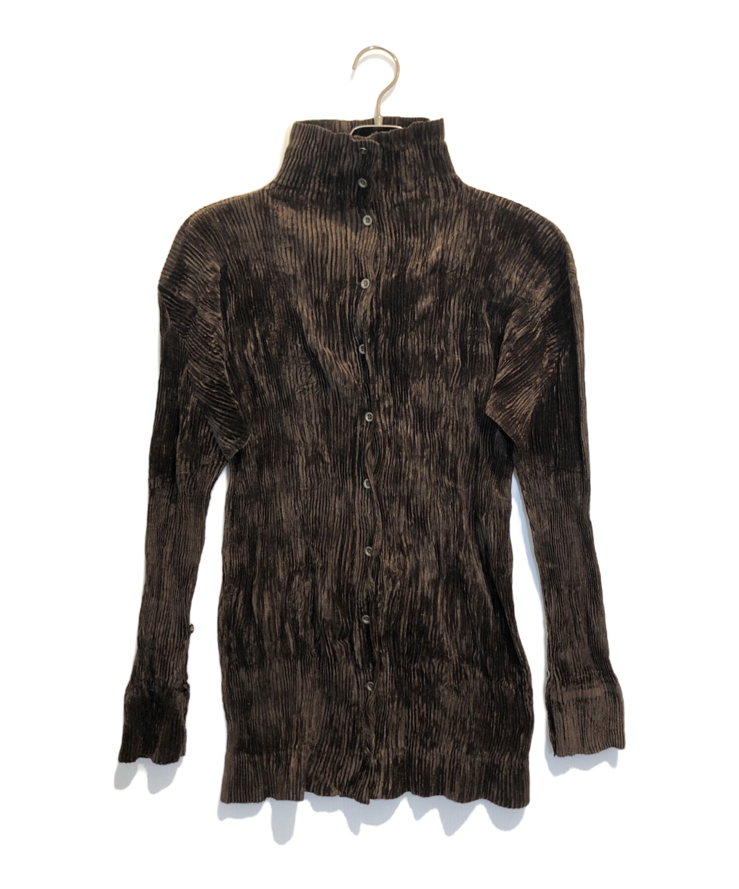 | スタッフコメント | プリーツのブラウス。襟を立ててハイネック風に、ボタンをはずしてシャツ風に、色んなスタイルで着用可能です。かなり伸縮性がある為採寸は目安になります。 |