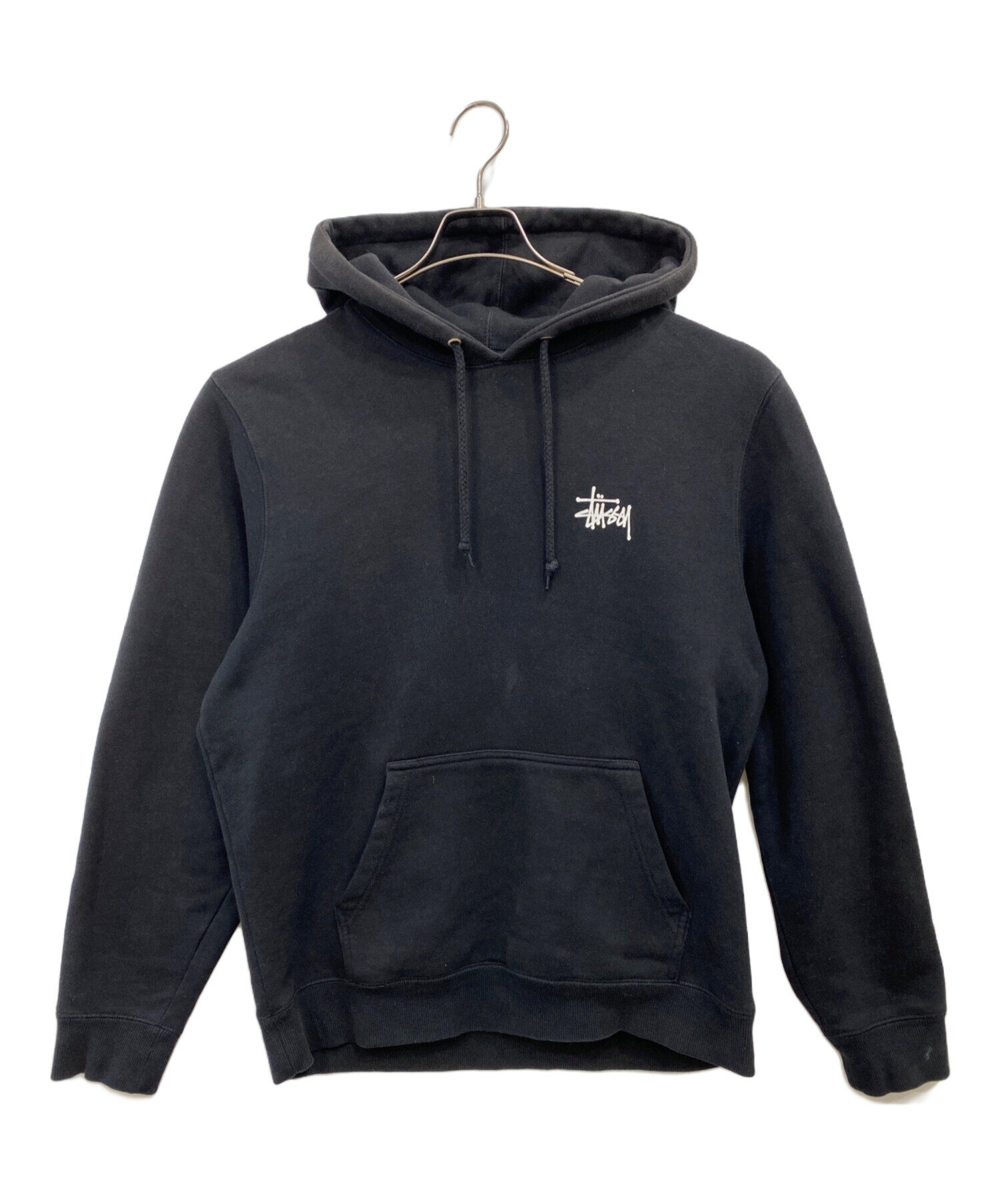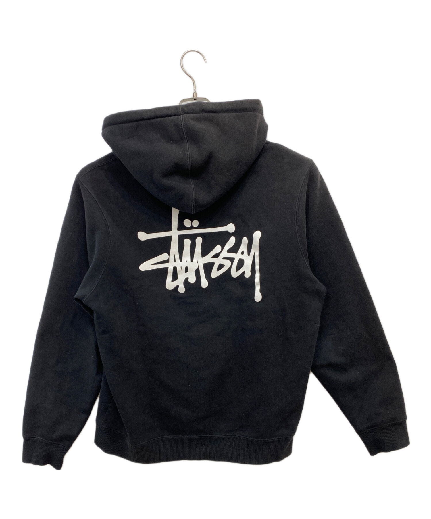 • stussy(ステューシー)stussy (ステューシー) ロゴプリントプルオーバーパーカー ブラック サイズ:Mの古着・服飾アイテム フード ヤケ有り