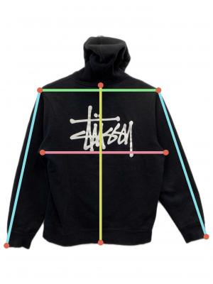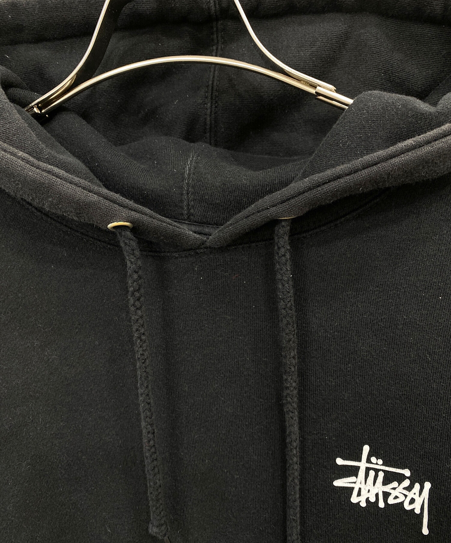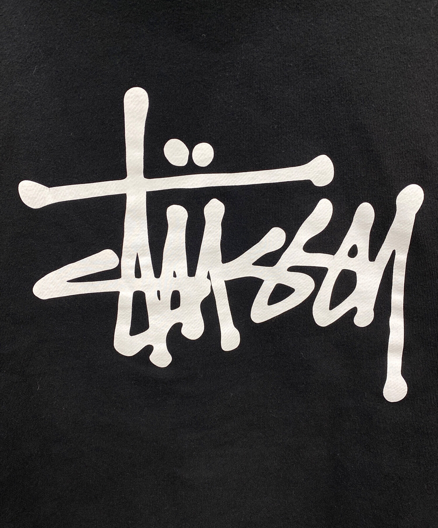• stussy(ステューシー)stussy (ステューシー) ロゴプリントプルオーバーパーカー ブラック サイズ:Mの古着・服飾アイテム 毛羽立ち有り
