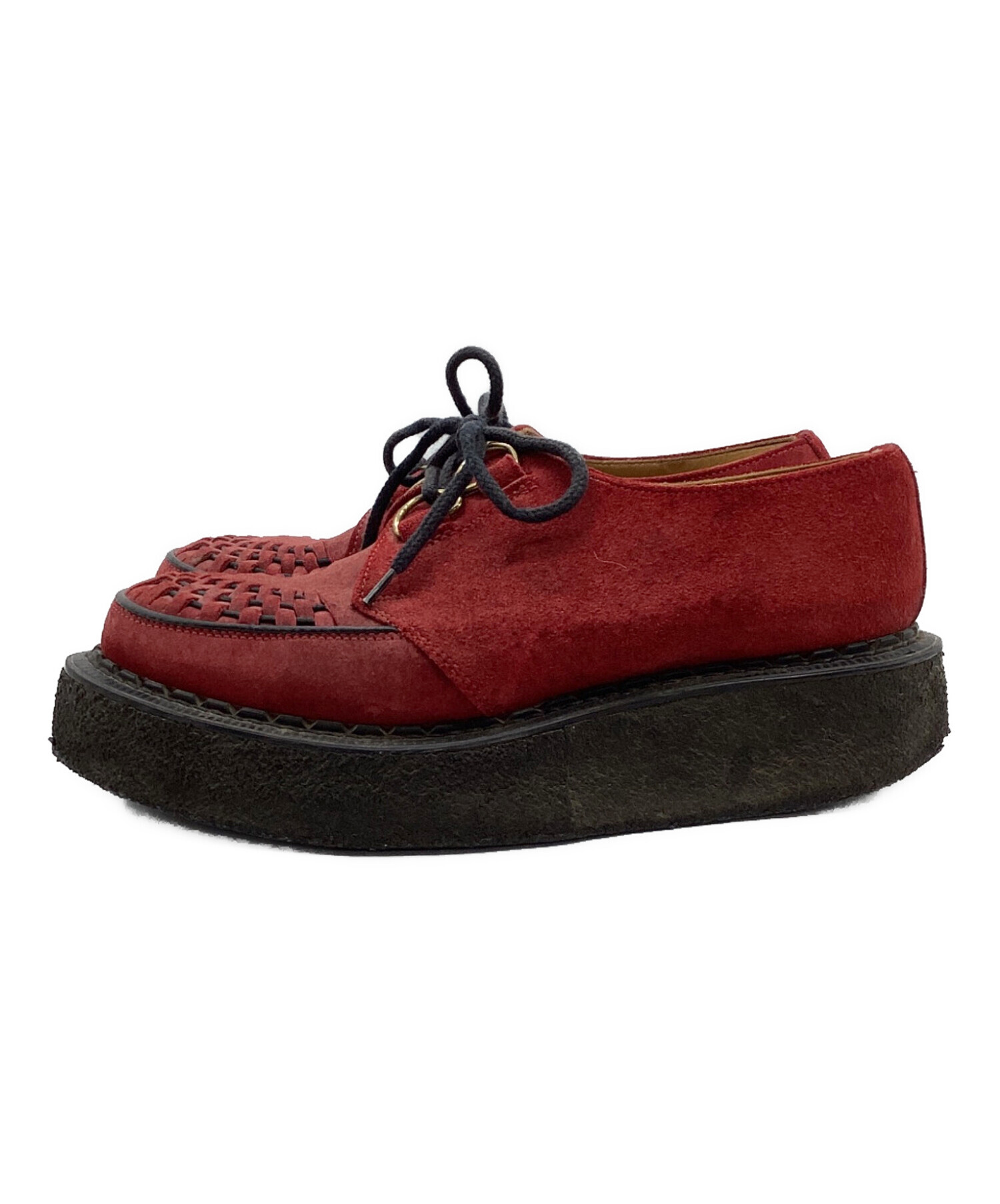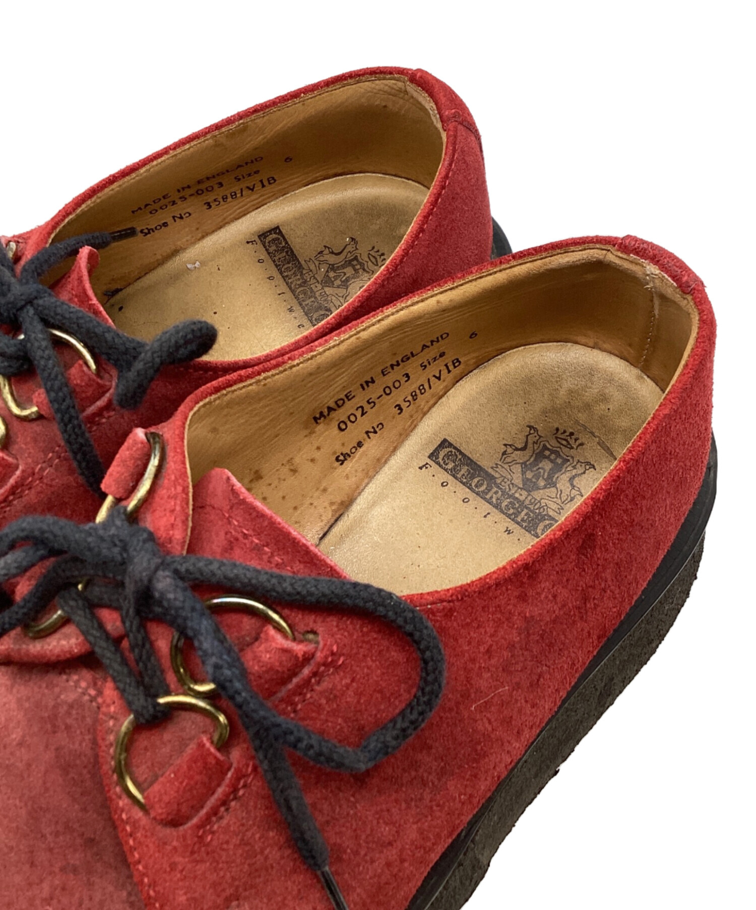 | スタッフコメント | 深い赤色のアウトソールに黒色のソールで落ち着いた印象を受けるスウェードシューズです。GEORGE COXらしさのある厚底ソールで、レザーシューズながらクッション性も良く、歩きやすい点も魅力的です。 |