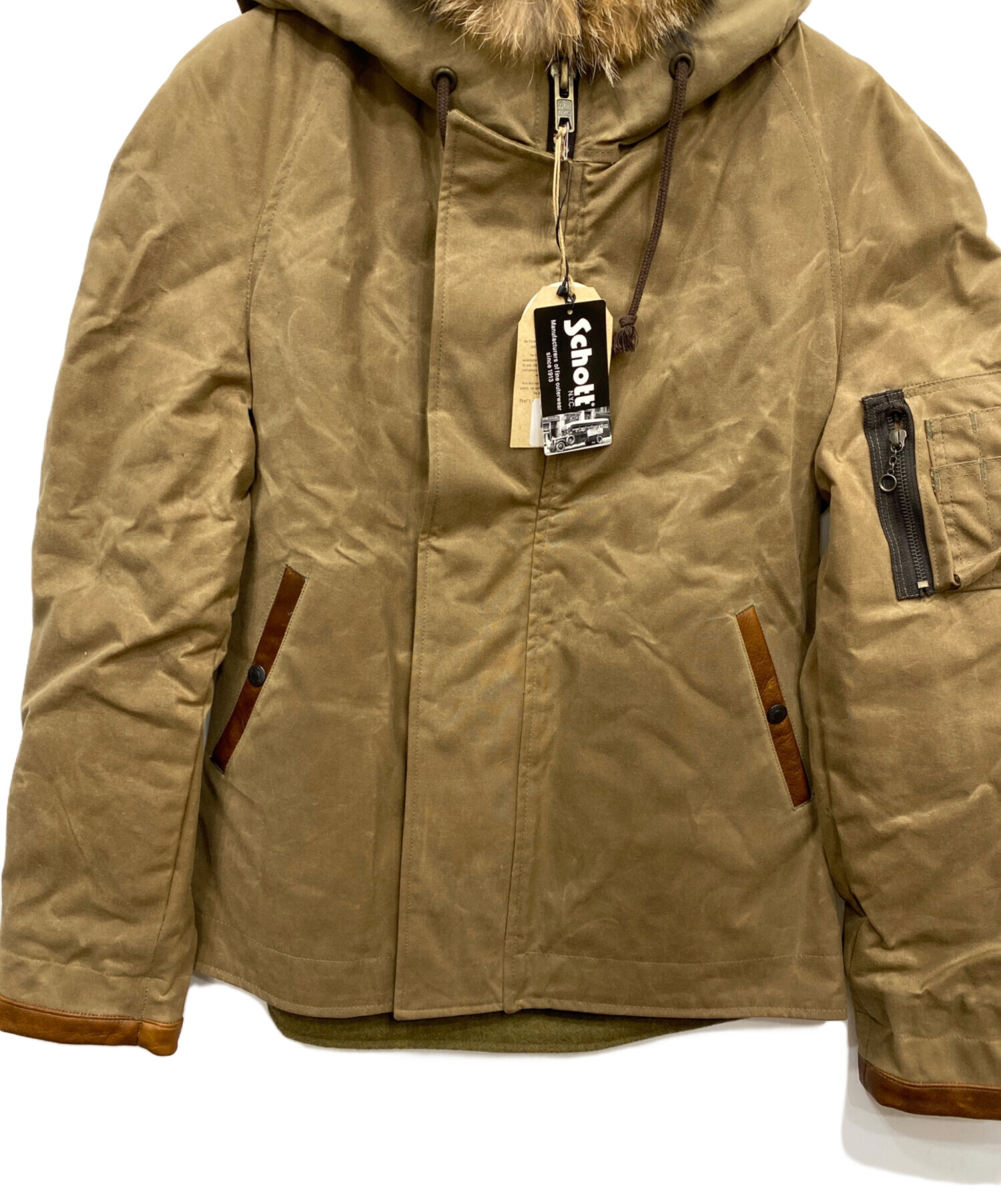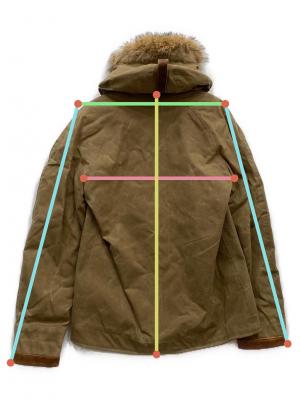 | 素材 | 表地: 綿 100%(ワックス加工) 身頃裏地: ウール 80% ナイロン 20% 袖裏地: ポリエステル 100% 中綿: ポリエステル 100% レザートリム: 本革 100% フード裏地: 綿 100% フード縁: コヨーテ 100% |
