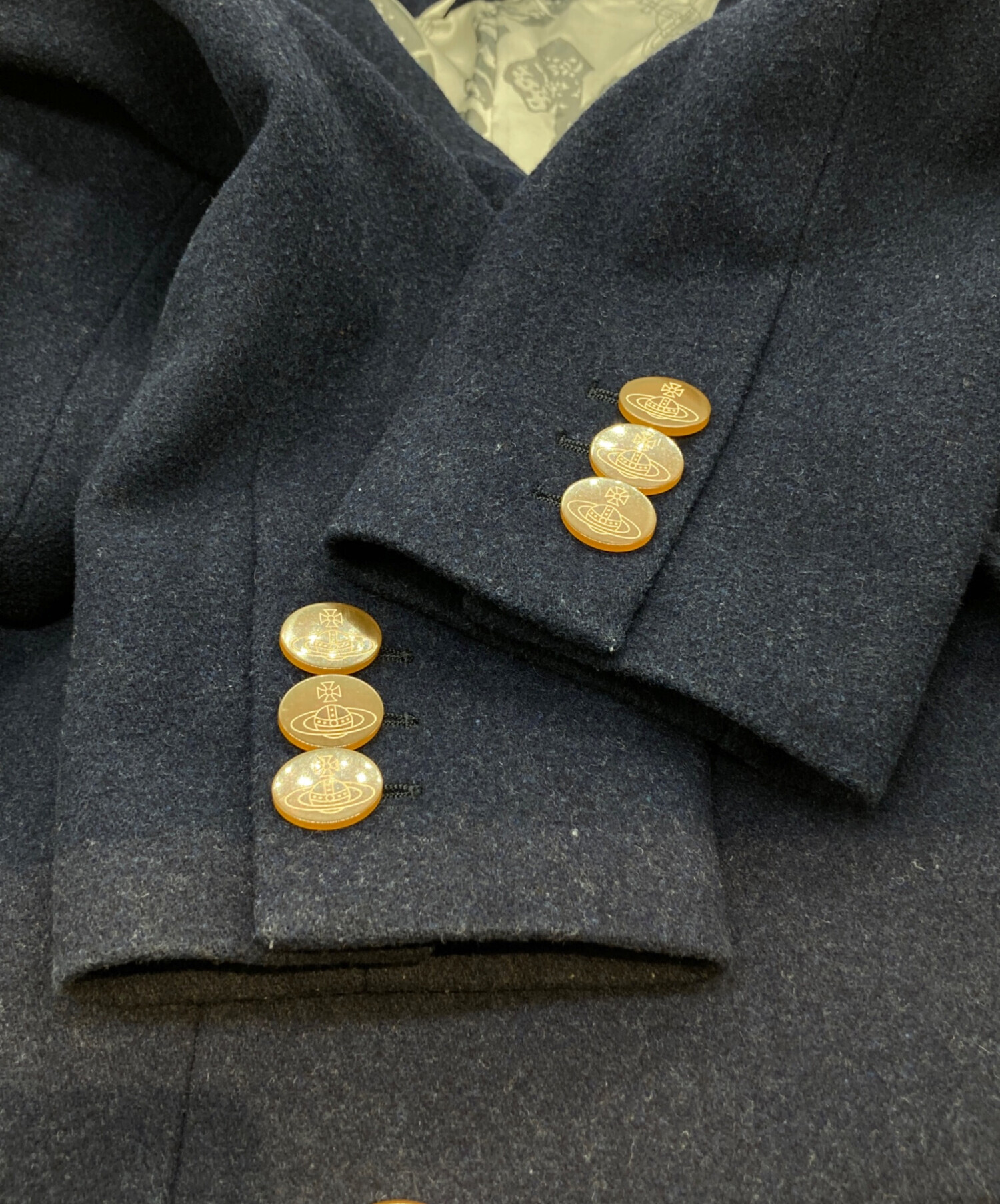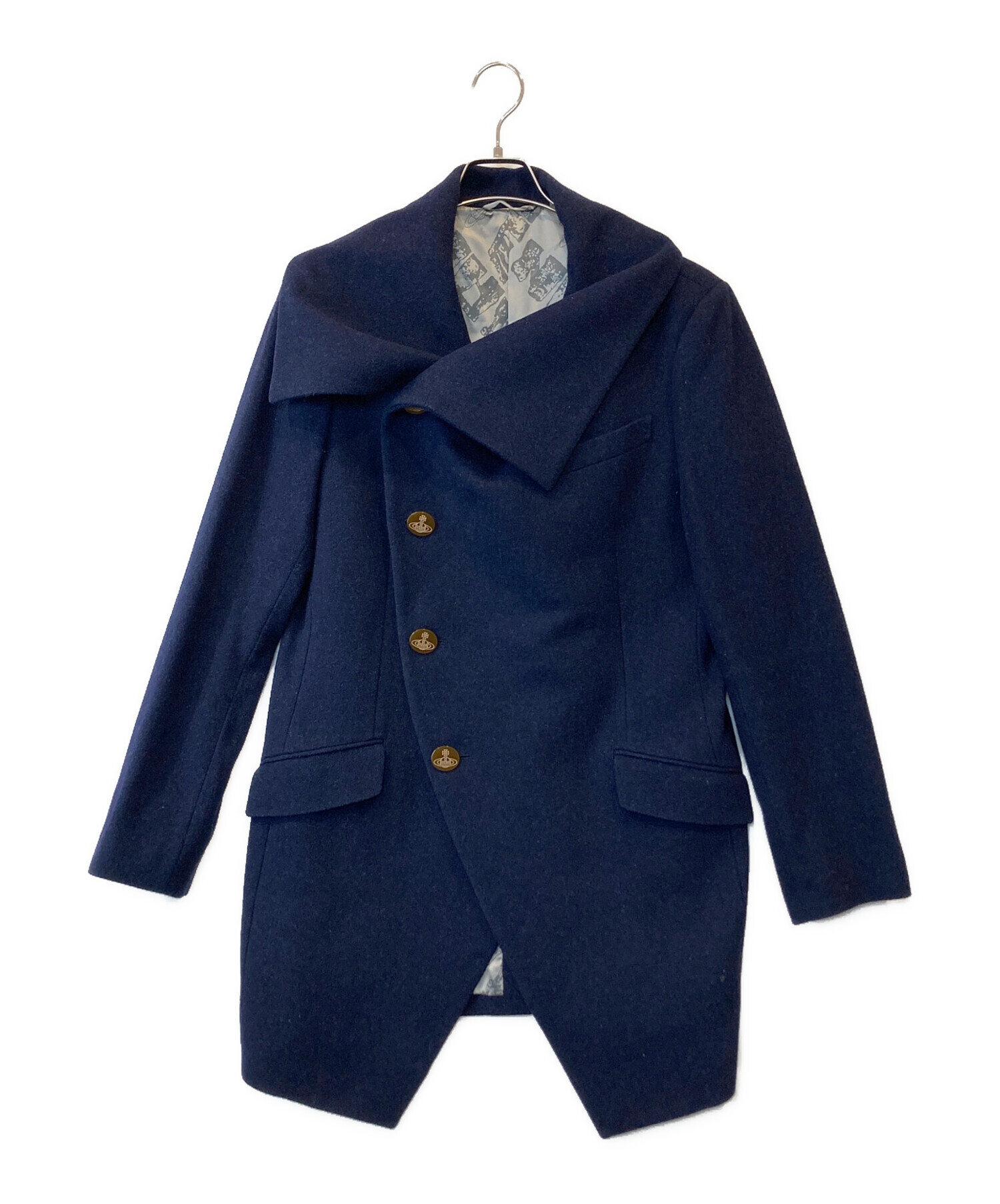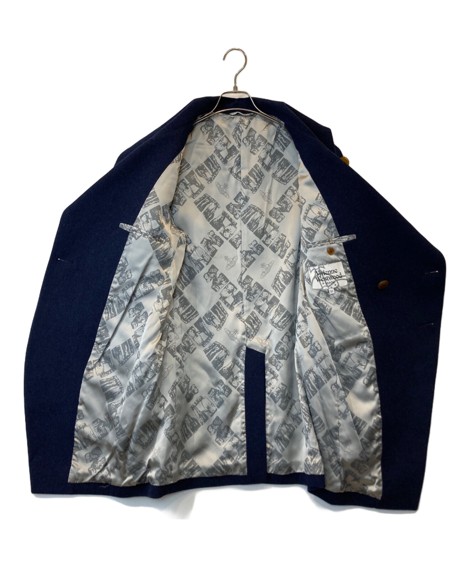 | スタッフコメント | 落ち着いたネイビーにブランドらしい遊び心あるデザインが映える一着です。SIZE 50でゆったりとした着用感が魅力。個性的ながら上品さも兼ね備えており、秋冬のコーデを格上げするメンズアウターをお探しの方におすすめです。 |