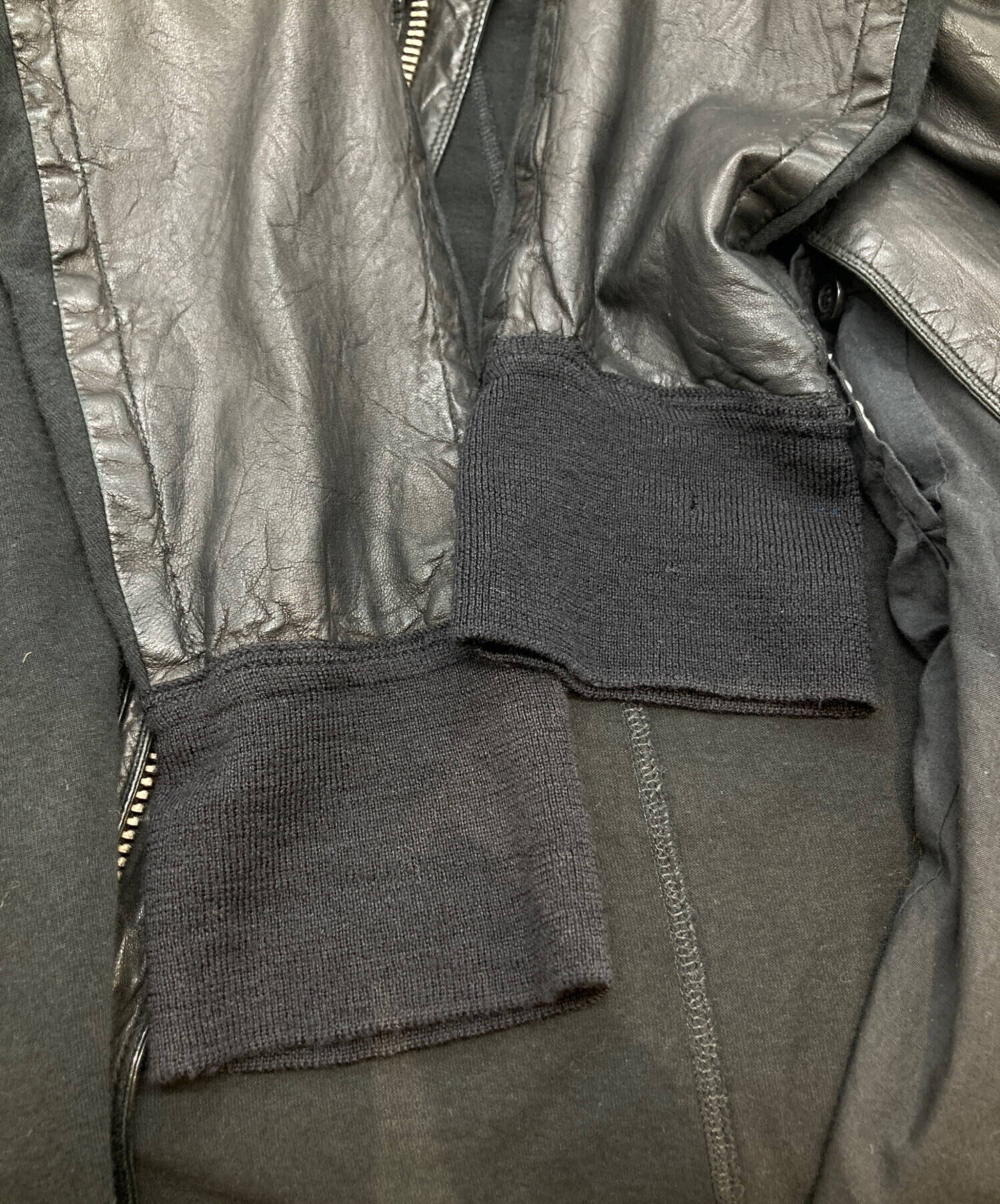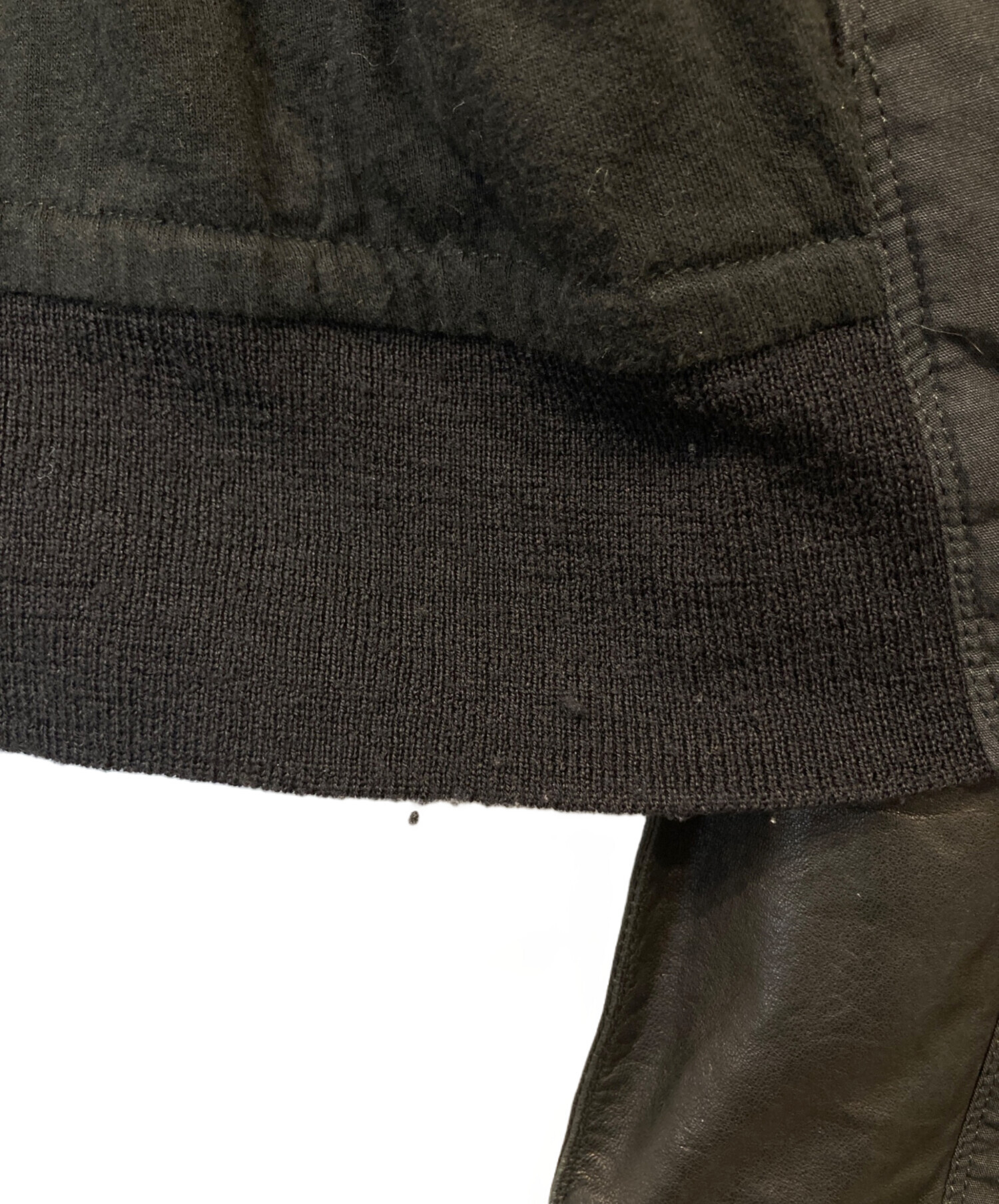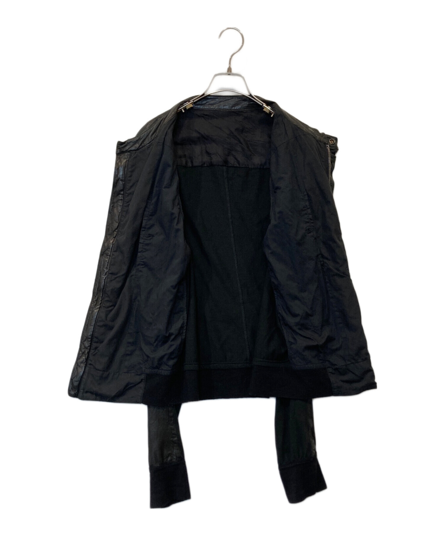 | スタッフコメント | ブランドらしい無骨で洗練されたデザインが魅力。ブラックカラーで統一された重厚感ある仕上がりに、異素材切替がアクセントを加えます。程よくタイトなシルエットでモードからストリートまで幅広く対応。袖リブにダメージはありますが、着用には問題なく、雰囲気ある一着としておすすめです。 |