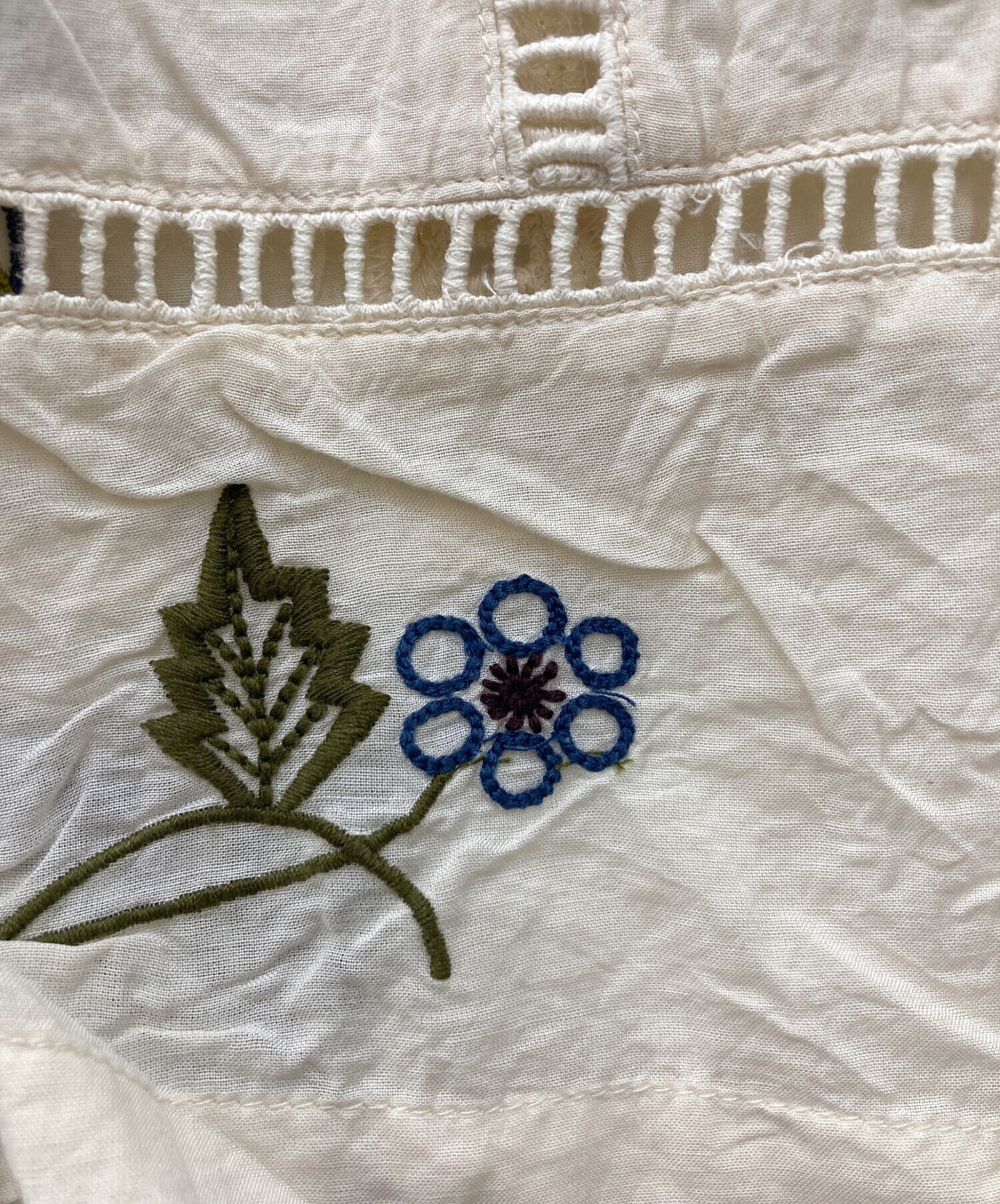 | 素材 | 表地: 綿 55% レーヨン 45% レース部分: 綿 100% 刺繍糸: ポリエステル 100% 裏地: 綿 55% レーヨン 25% |