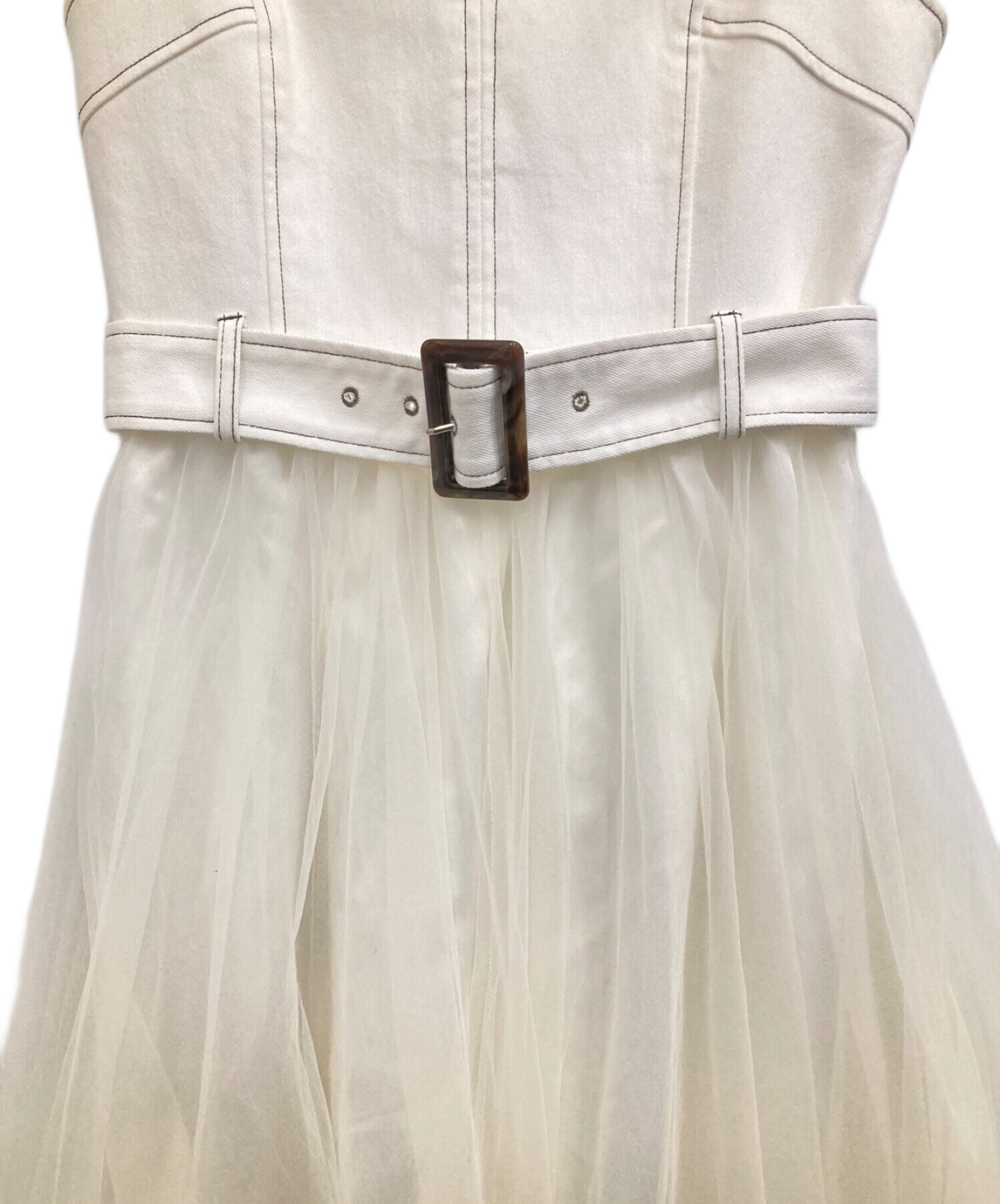| スタッフコメント | 二重になったチュールが立体感を生み出し、デニムとの切替えもアクセントとなっています。ショルダー部分は、調整可能なキャミソールワンピースです。 |