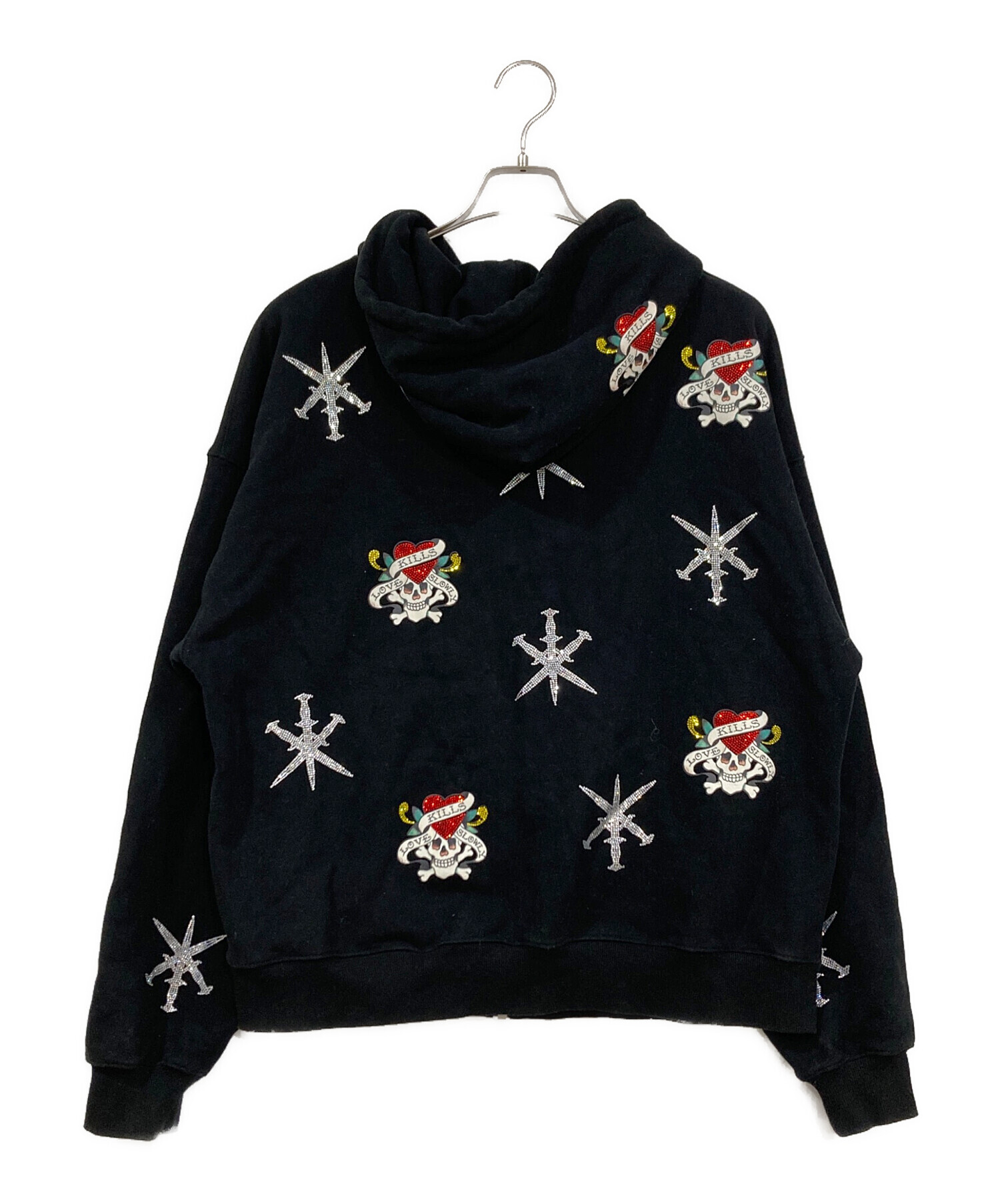 • unknown(アンノウン)Unknown (アンノウン) ED HARDY (エド ハーディー) ラインストーンジップパーカー ブラック サイズ:Lの古着・服飾アイテム 金具使用感有
