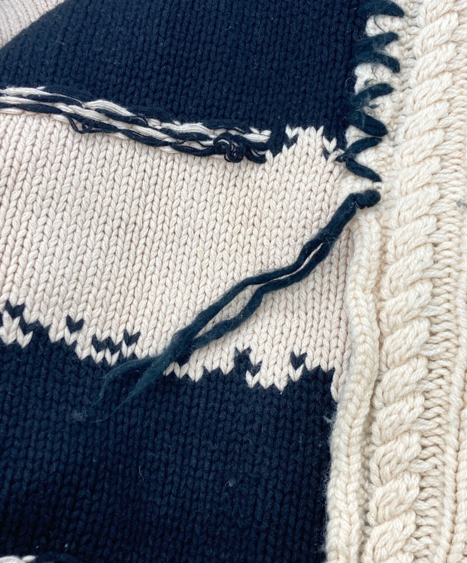 | 素材 | ケーブル編み部分:ウール80%ナイロン20% ボーダー部分:コットン60%アクリル40% 手縫い箇所:アクリル100% |