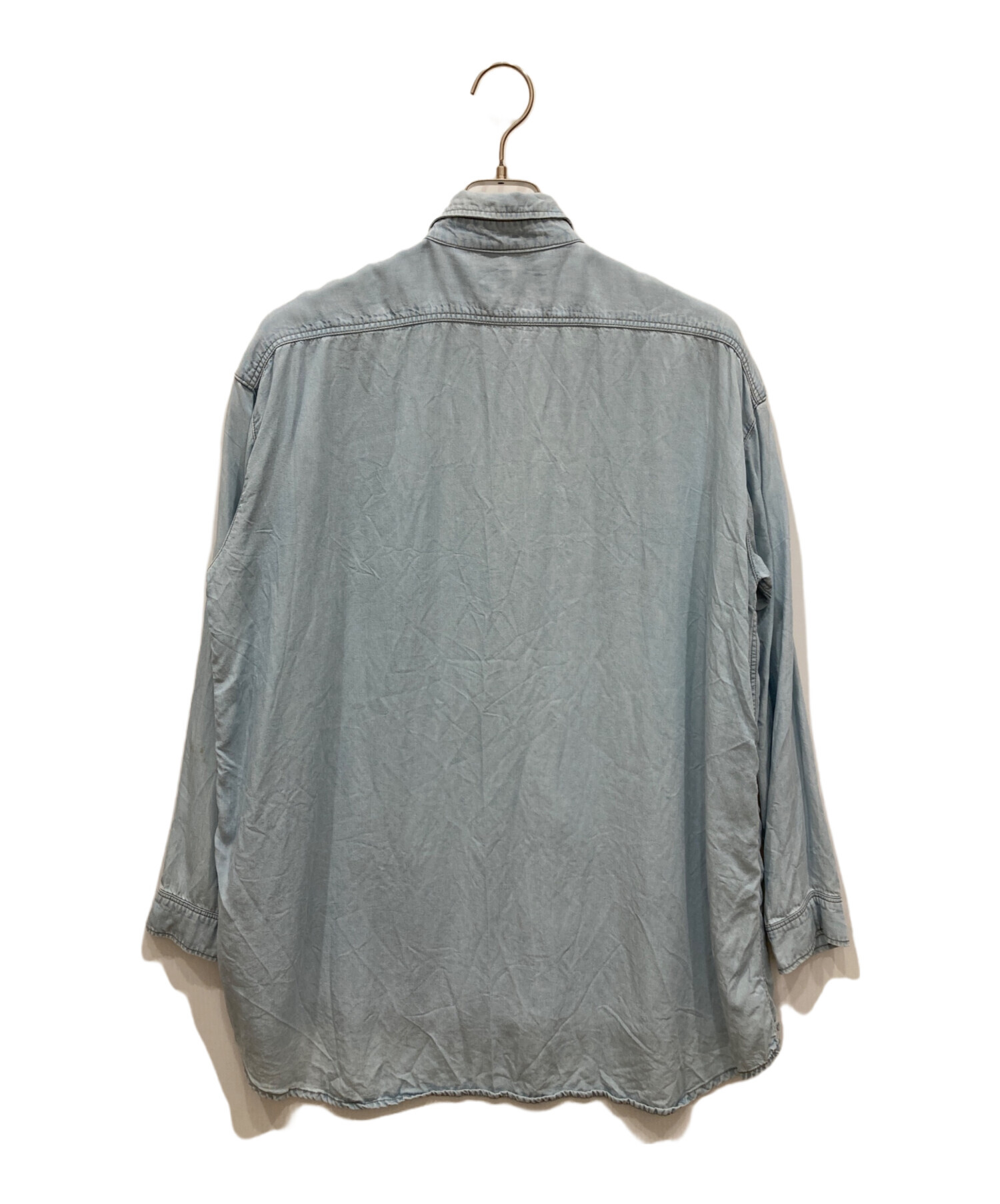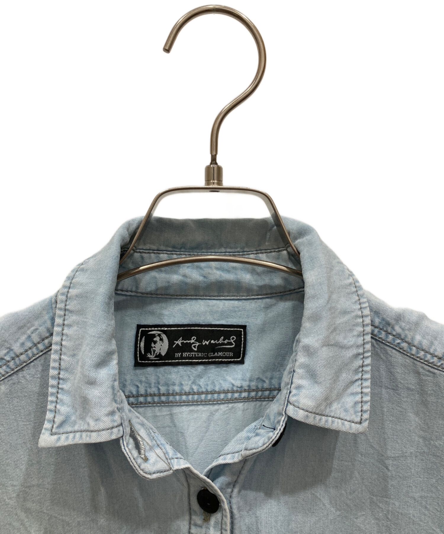 • Andy Warhol by HYSTERIC GLAMOUR(アンディーウォーホルバイヒステリックグラマー)Andy Warhol by HYSTERIC GLAMOUR (アンディーウォーホルバイヒステリックグラマー) 00’sスカルプリントデニムシャツ スカイブルー サイズ:freeの古着・服飾アイテム 背部ヨゴレ