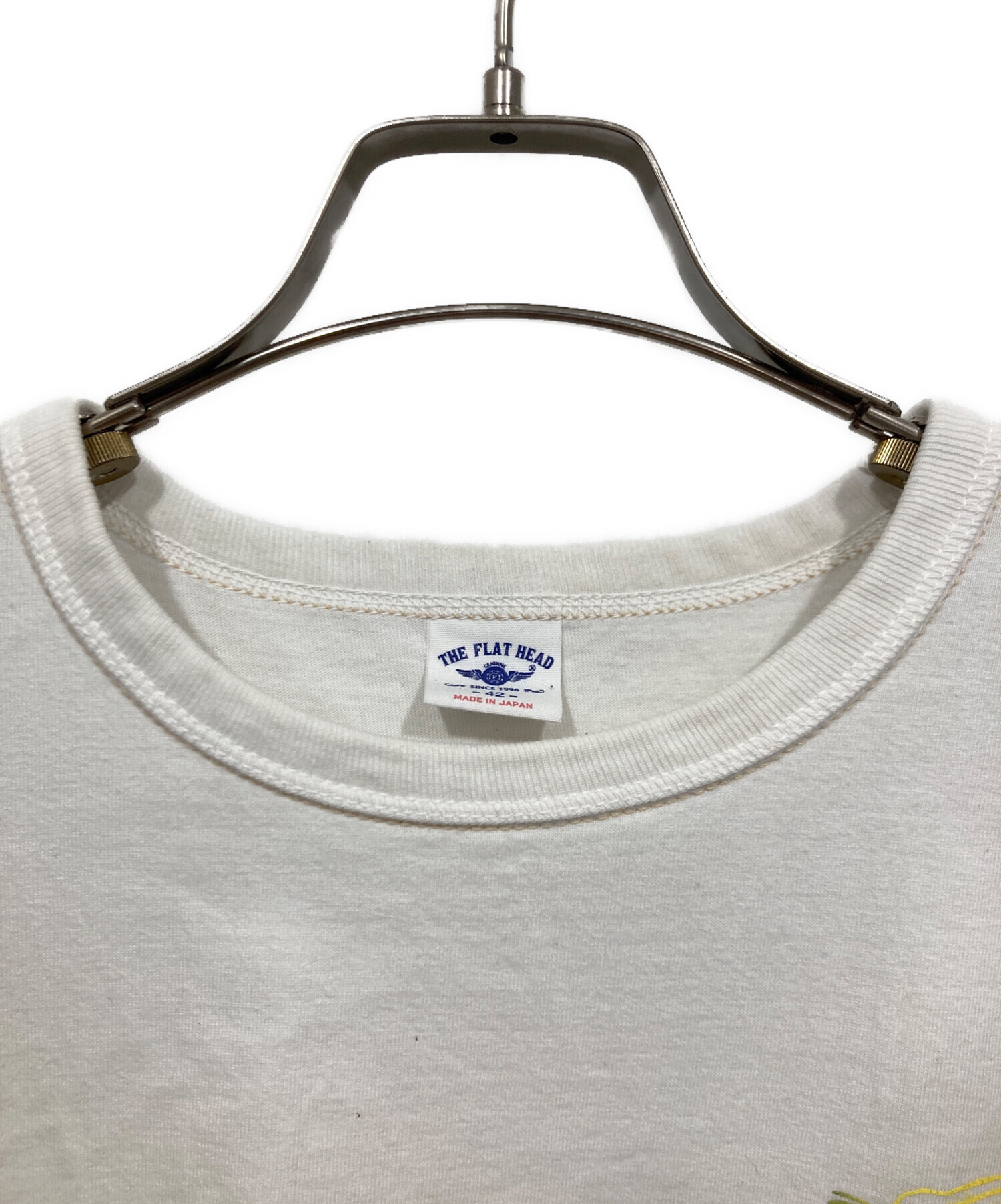 • THE FLAT HEAD(ザ・フラットヘッド)THE FLAT HEAD (ザ・フラットヘッド) プリントTシャツ ホワイト サイズ:42の古着・服飾アイテム 襟ヨゴレ有