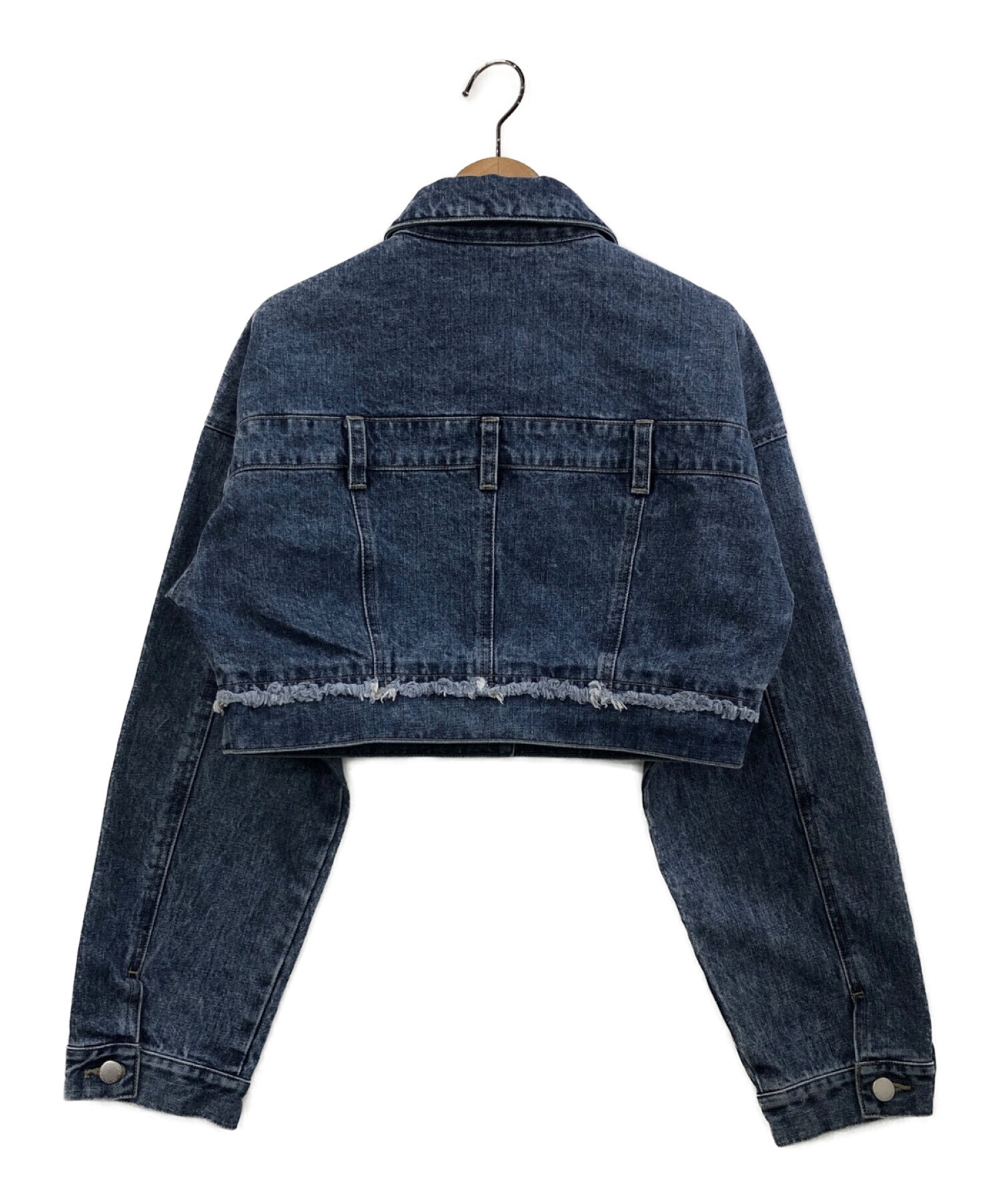 | スタッフコメント | ハリのある生地を使用したクロップドデニムジャケットです。ベルトループが施されたデニムパンツのようなディテールが特徴です。カットオフ加工の裾とボリュームスリーブデザインもポイントです。 |
