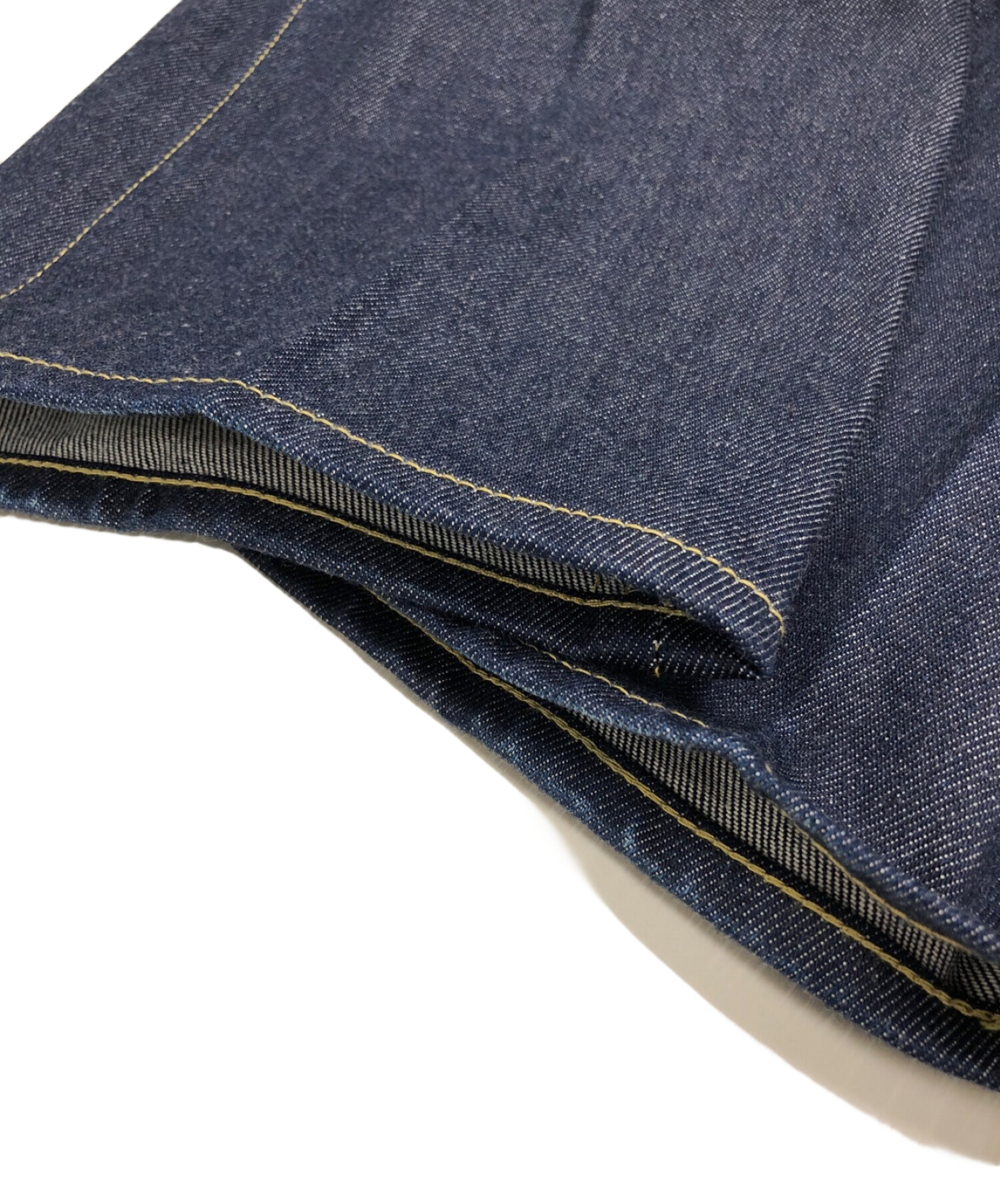 | スタッフコメント | センタープレスが施されたストレートデニムパンツです。コットン100%生地を使用し、ハリのある仕上がりになっています。程良くゆとりのあるシルエットとイエローステッチがポイントです。 |