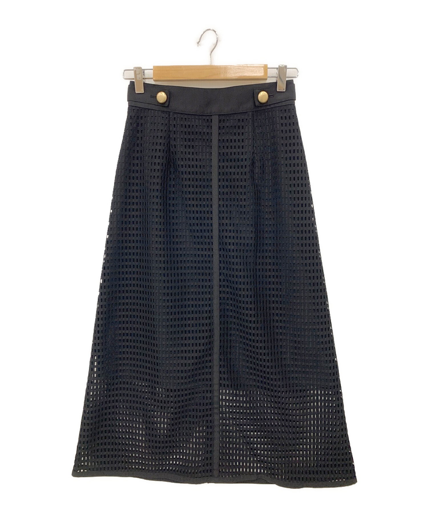 | スタッフコメント | ウエストに施された幅広のグログランテープやメタルボタンがアクセントになったAラインスカートです。広がりを抑えたフレアシルエットでスッキリとご着用いただけます。伸縮性抜群の裏地が用いられているため、動きやすく穿き心地も抜群です。 |
