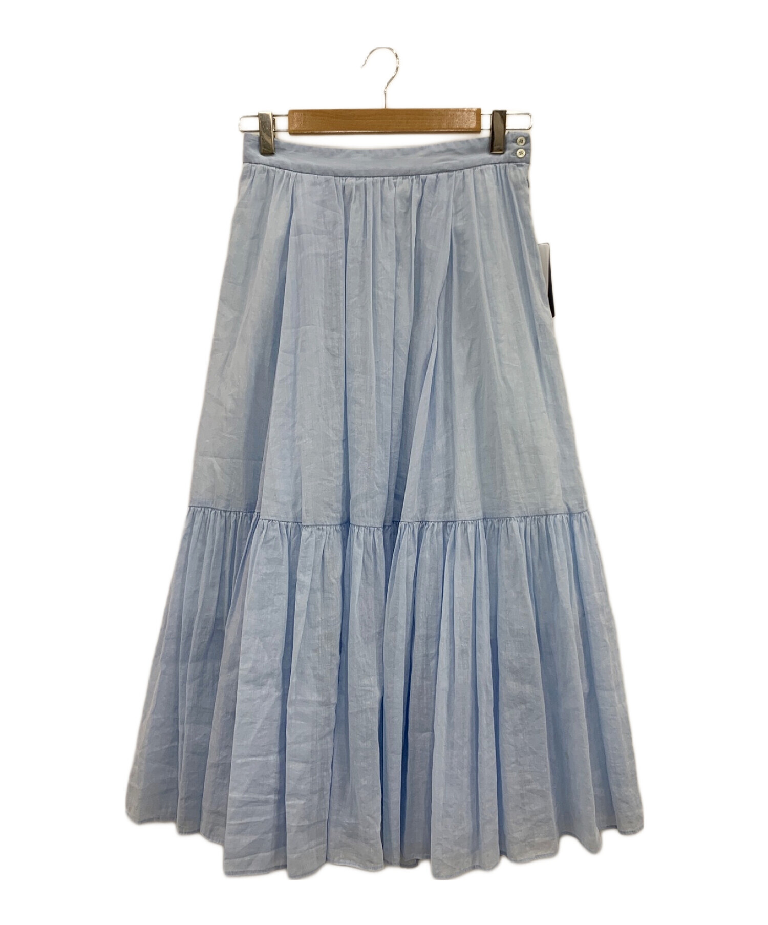 | スタッフコメント | サラサラとしたリネンコットン混紡生地を使用したマキシスカートです。裏地を短くしたことによって、膝下からは透け感のあるデザインとなっております。ギャザーを施したティアードデザインで、分量のあるフレアシルエットでご着用いただけます。 |