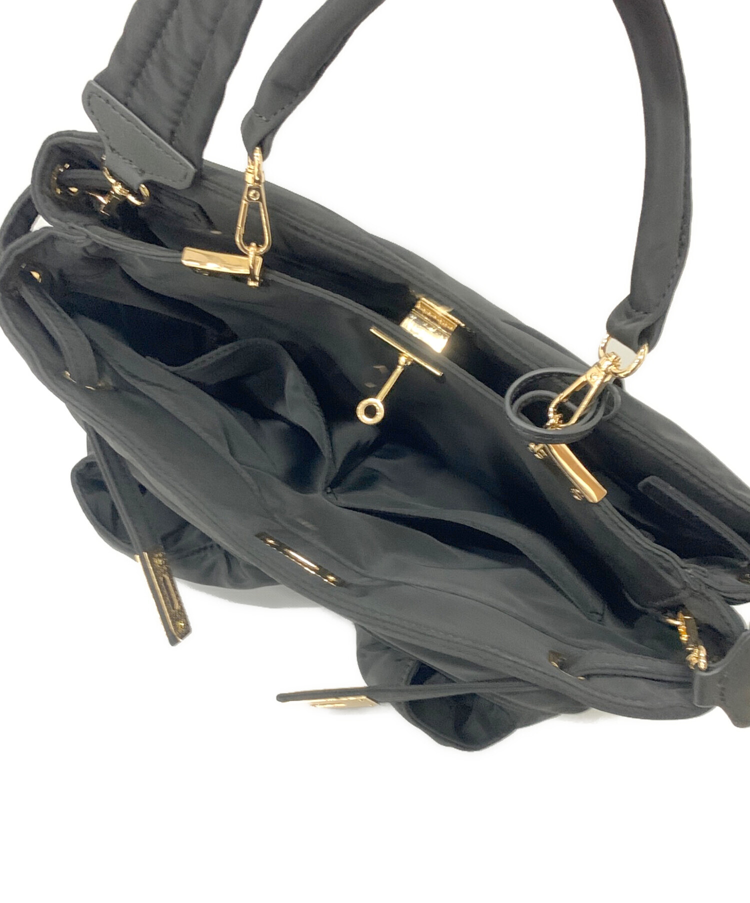 | スタッフコメント | 滑らかなナイロン調素材を使用したショルダーバッグです。幅広のストラップと、ハンドルはお好みで取り外してご使用いただけます。仕切り付きで整理がしやすいデザインになっています。 |