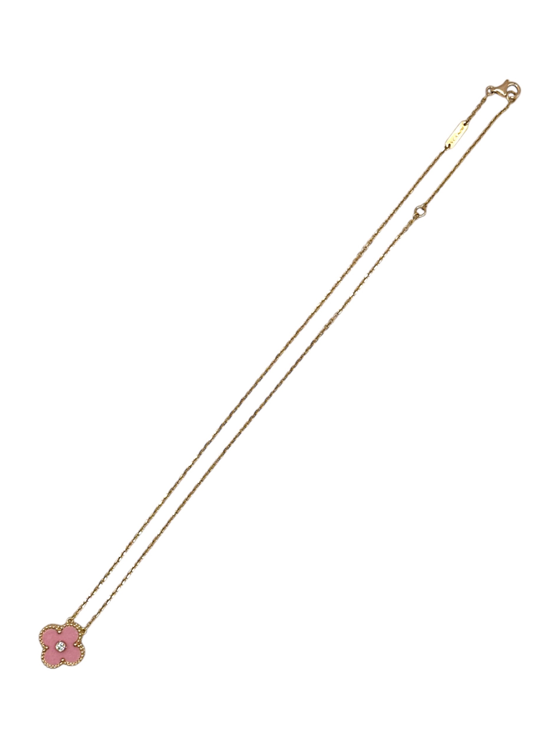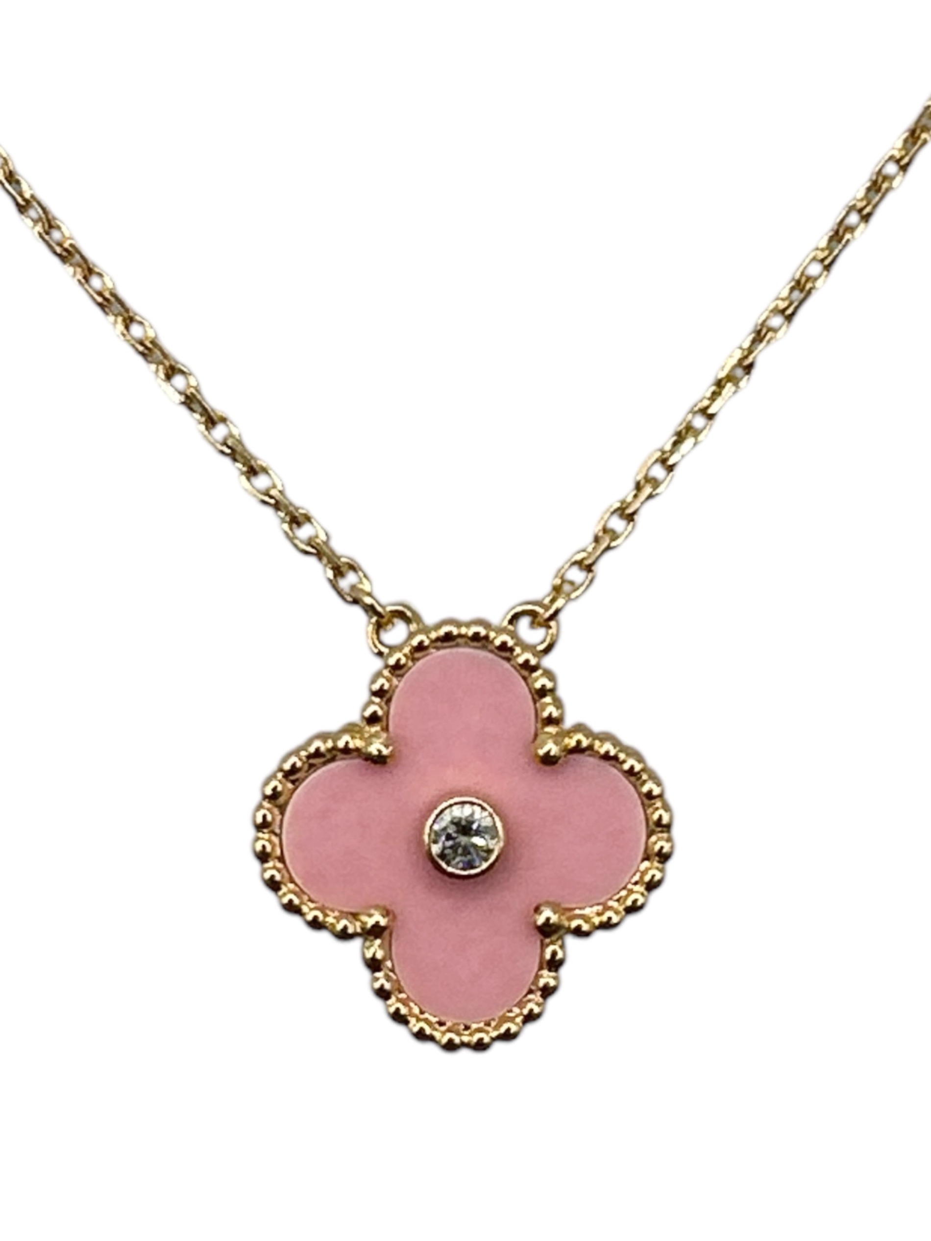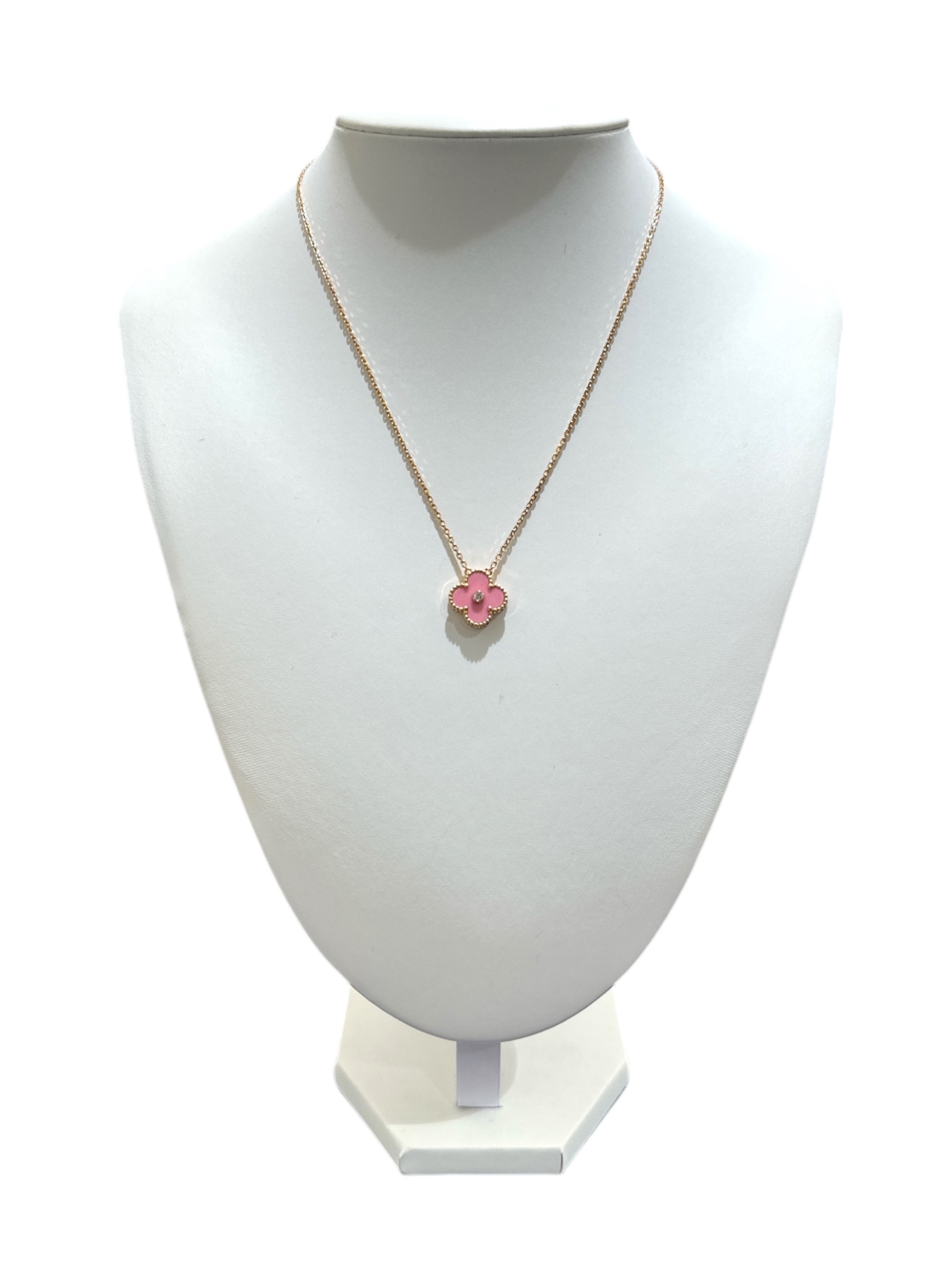 スタッフコメント K18のピンクゴールド素材のチェーンとライトピンクカラーのチャームの組み合わせがフェミニンで高級感を演出したアルハンブラでございます。チャームのセンターにセットされたダイヤモンドが上品かつ華やかな印象で、目を惹くアクセントとなっております。エレガントなデザインと上質な素材が融合し、日常の装いに特別な輝きを添えるアクセサリーとして魅力的なアイテムです。