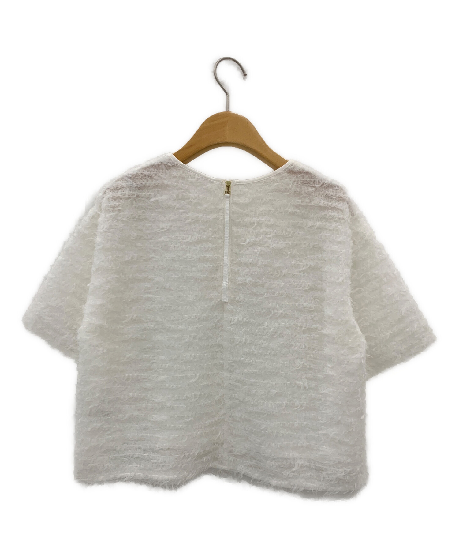 | スタッフコメント | 柔らかいチュール生地に施されたフェザーが目を引くクルーネックTシャツです。バックジッパーに施されたリボンがアクセントになっています。ポリエステル100%素材を使用したやや透け感のある生地は柔らかく、サラサラとした肌当たりで通気性もよく着心地抜群です。存在感を放つデザインでコーディネートのポイントとしてもオススメのアイテムです。 |