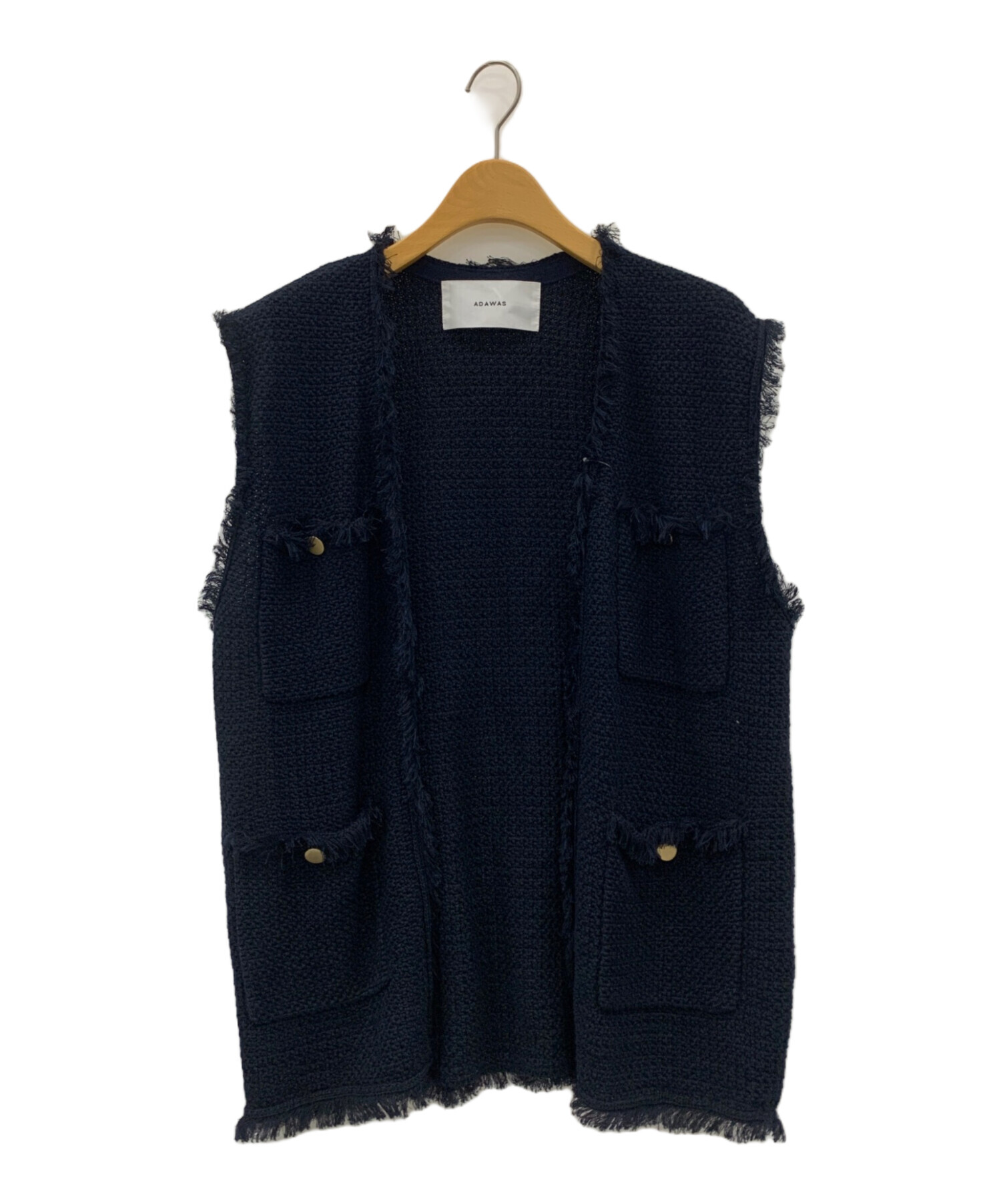 | スタッフコメント | さらりとしたコットン混紡生地を使用したボタンレスベストです。フロントポケットに施されたゴールドカラーのボタンがポイントです。各所のフリンジ加工もアクセントになっております。 |
